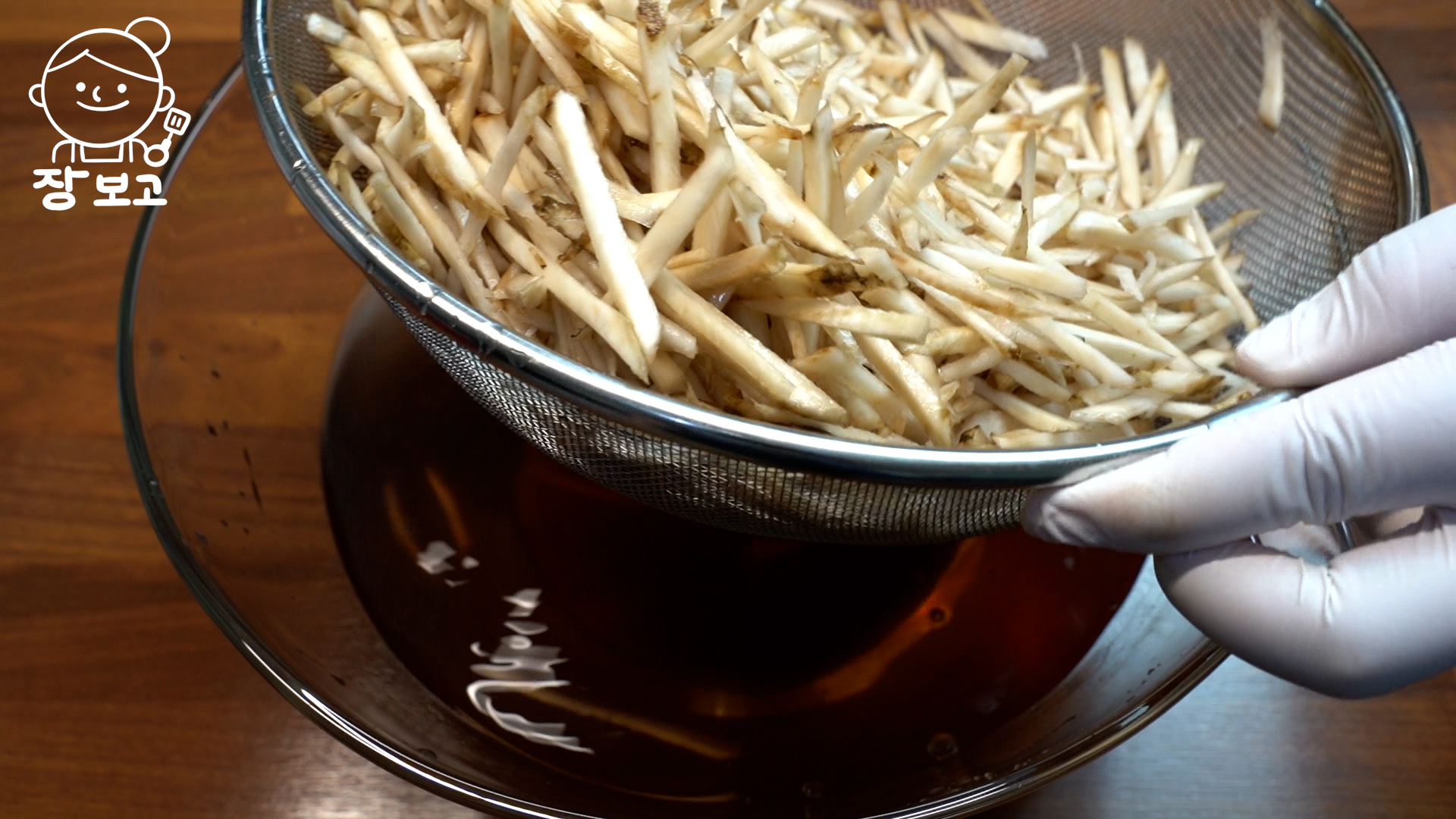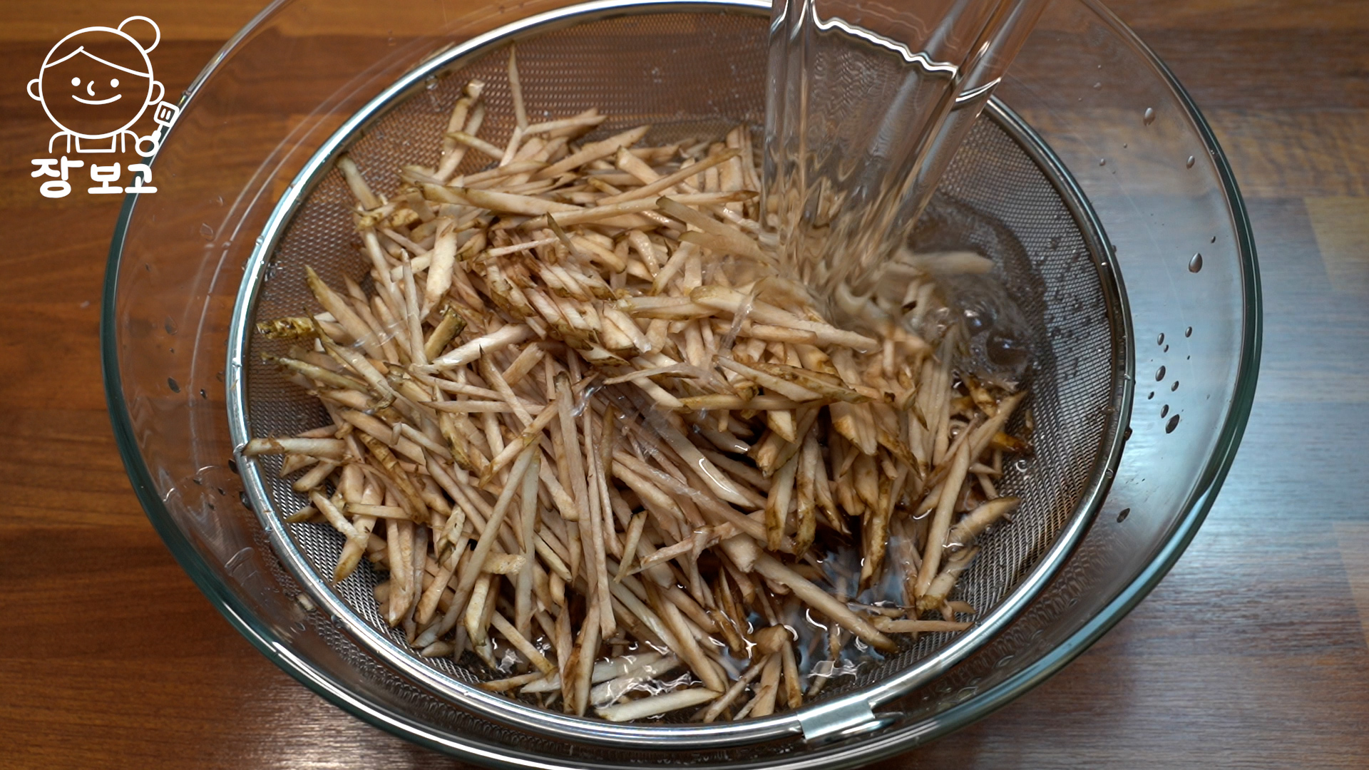 3. 하얘진 우엉은 물기를 털어 잠시 대기한다.