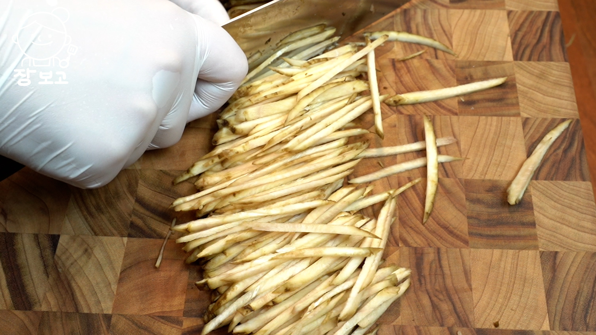 2. 마르고 질긴 끝 부분은 제거하고 성냥개비 두께로 채 썬다. 써는 동안 갈변이 된 우엉은 물에 5분간 담근다.