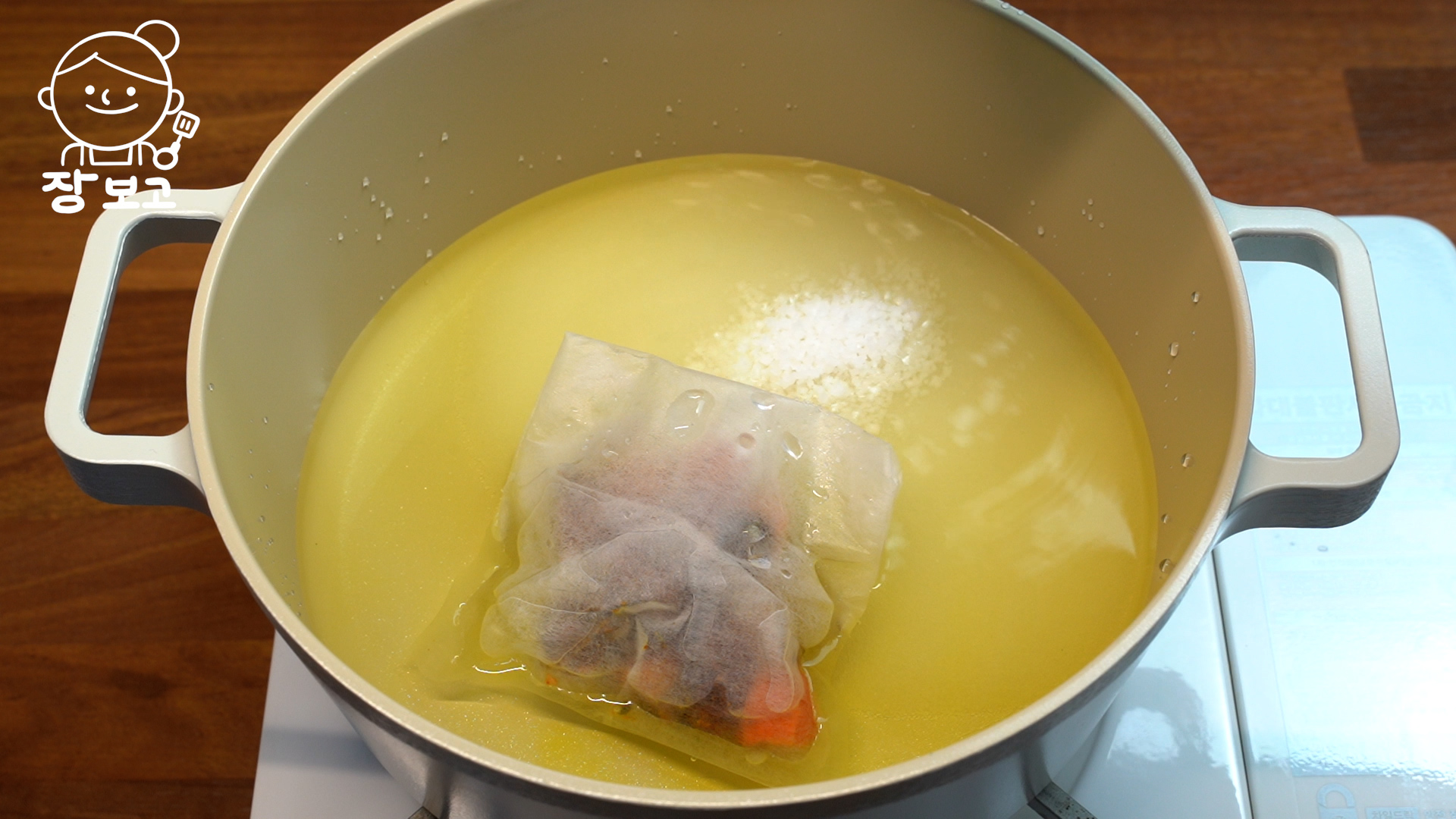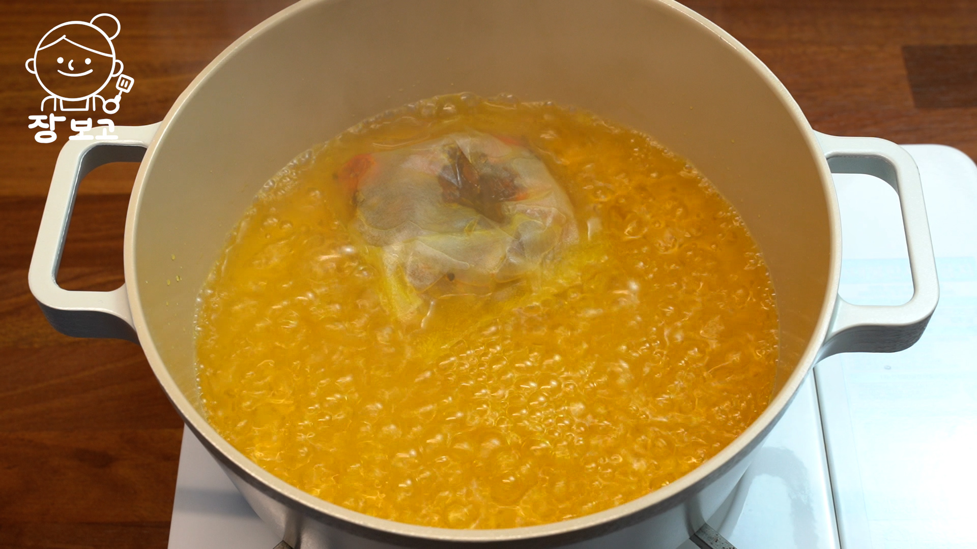 6. 냄비에 치자 다시백, 물, 설탕, 굵은소금을 넣고 바글바글 끓으면 불을 끈다.