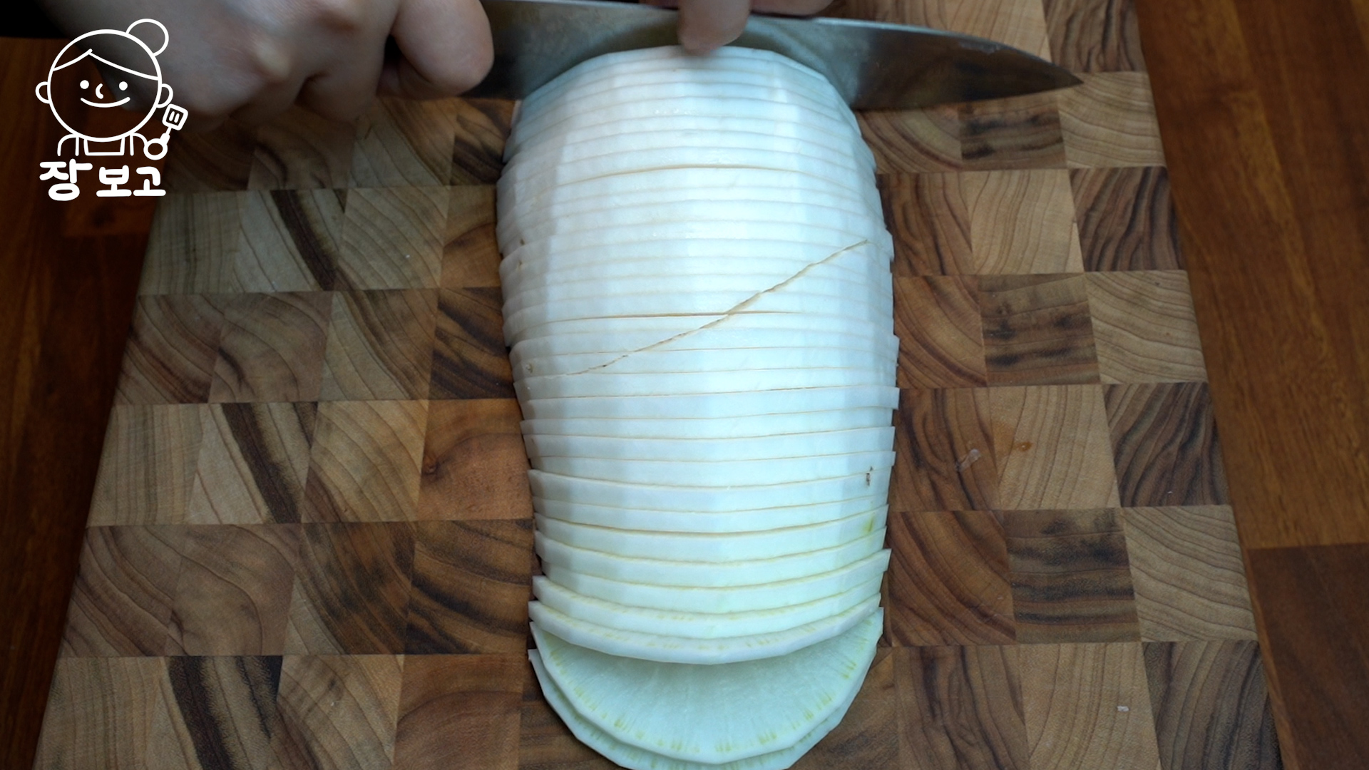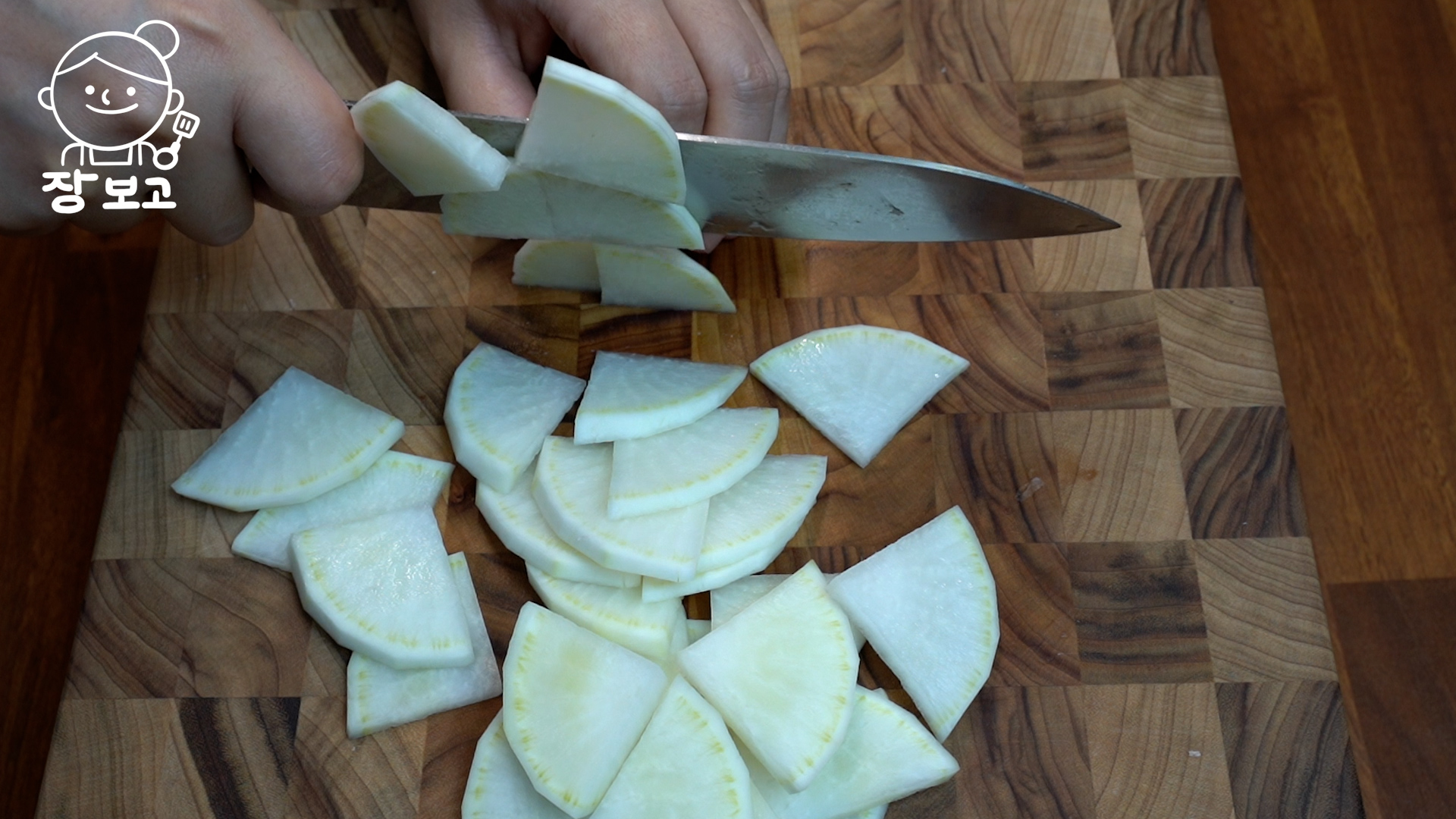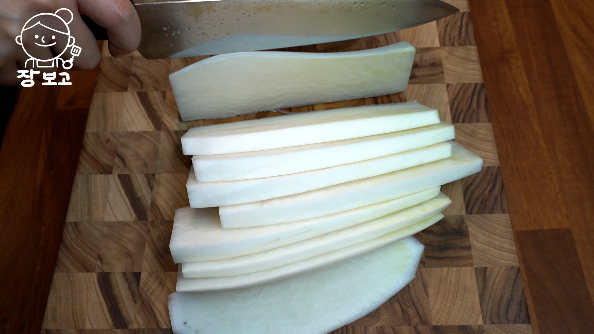 4. 나머지 자투리는 1/4 조각으로 얇게 썬다. 나중에 무쳐먹으면 맛있다.