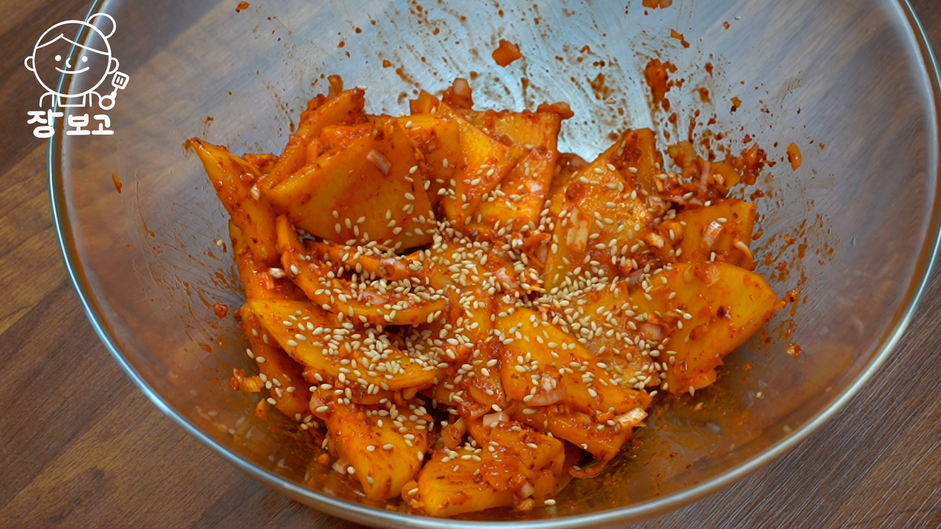 반찬용 단무지에 다진 파, 다진 마늘, 고춧가루, 참기름 모두 한 큰 술씩 넣고 통깨 솔솔 뿌리면 초간단 단무지 무침 완성이다.
