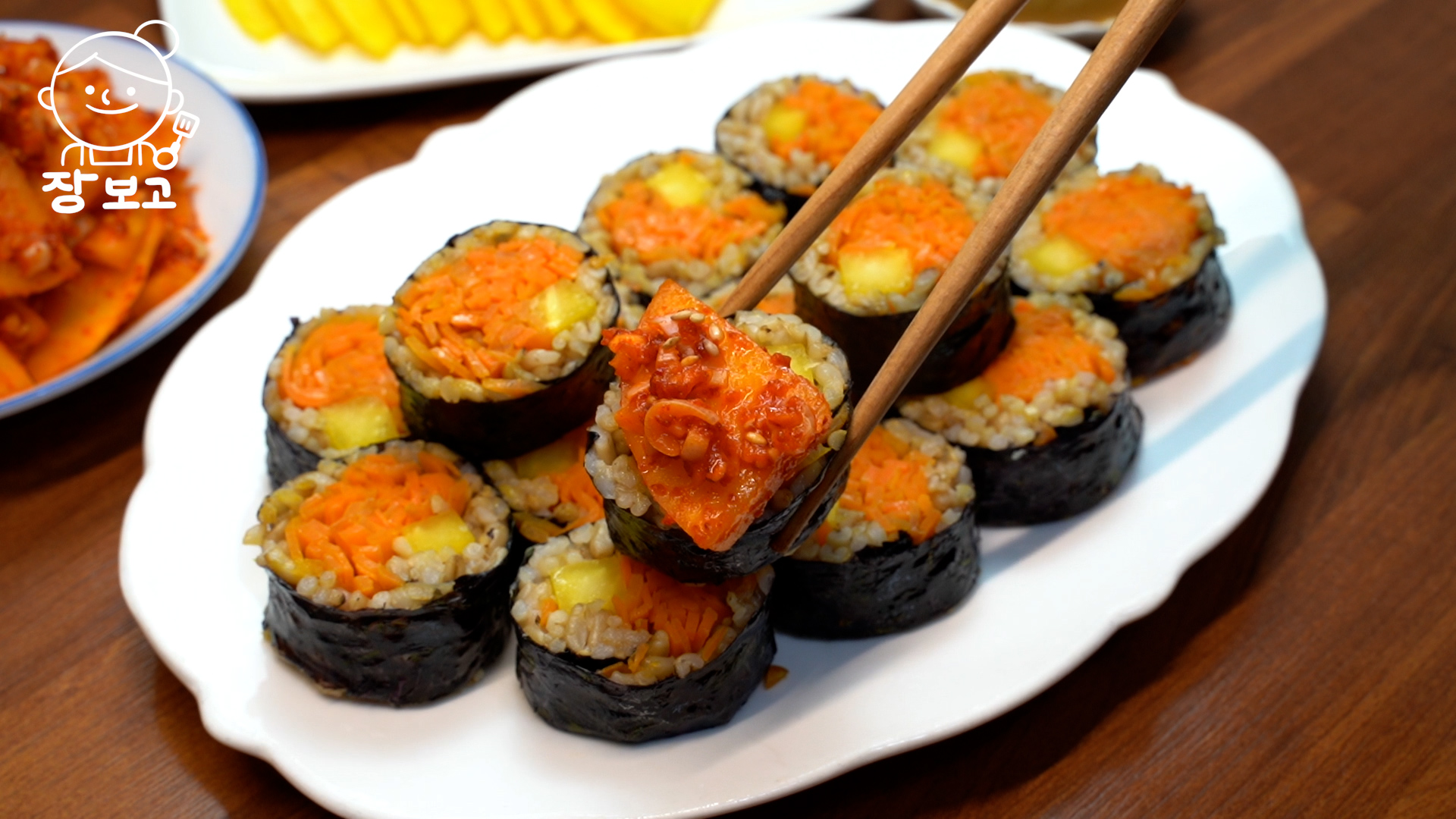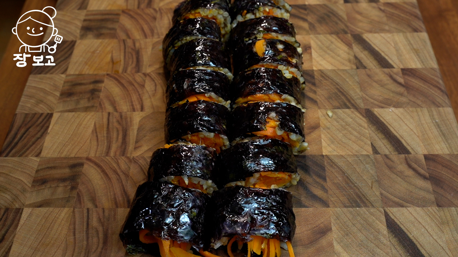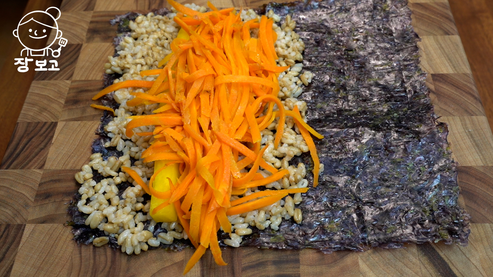 김에 밥 깔고 볶은 당근과 단무지를 넣어 김밥을 만든다.