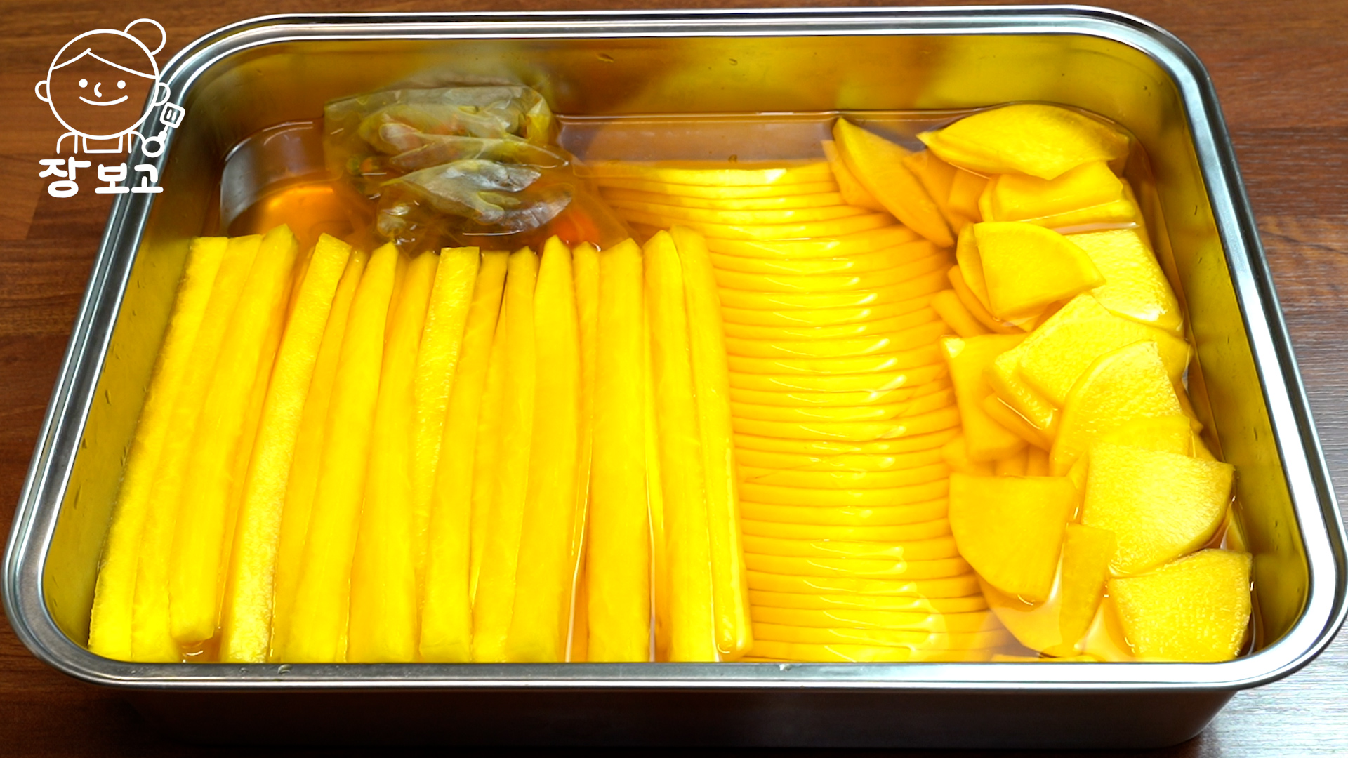 8. 식은 단촛물을 무에 부어주고 상온에서 하루 둔다. 단촛물을 부었을 때 자박해야 무에서 1시간 내로 수분이 나와 알맞게 잠긴다.