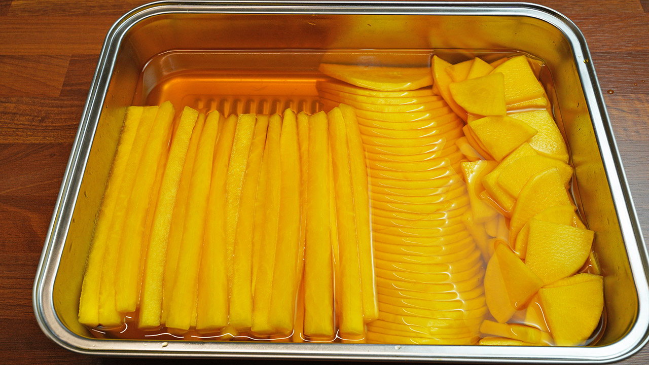 치자색이 노랗게 물들어서 먹음직스럽다. 치자가 없으면 그냥 하얀 단무지로 만들거나, 비트를 조금 넣으면 붉은색 단무지가 된다.