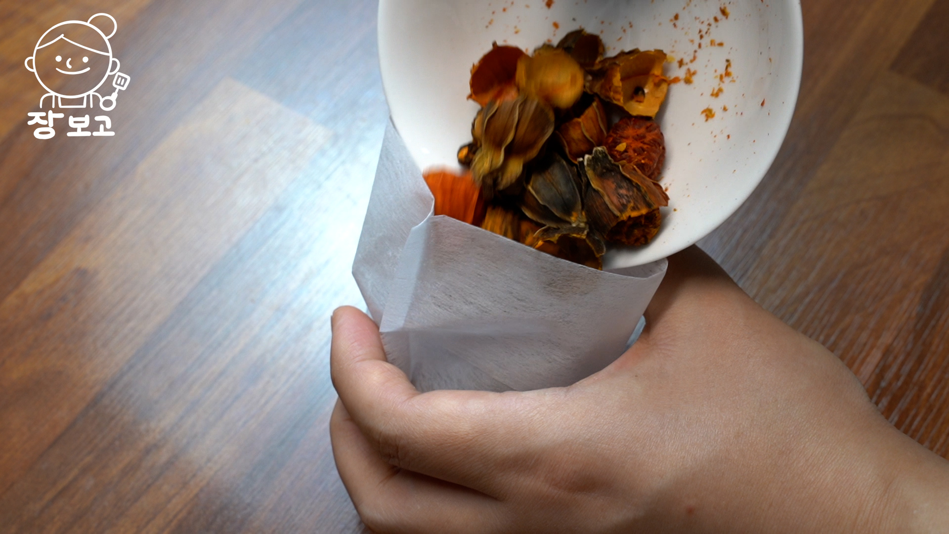 5. 치자는 부수거나 가위로 잘라 다시백에 넣어준다.