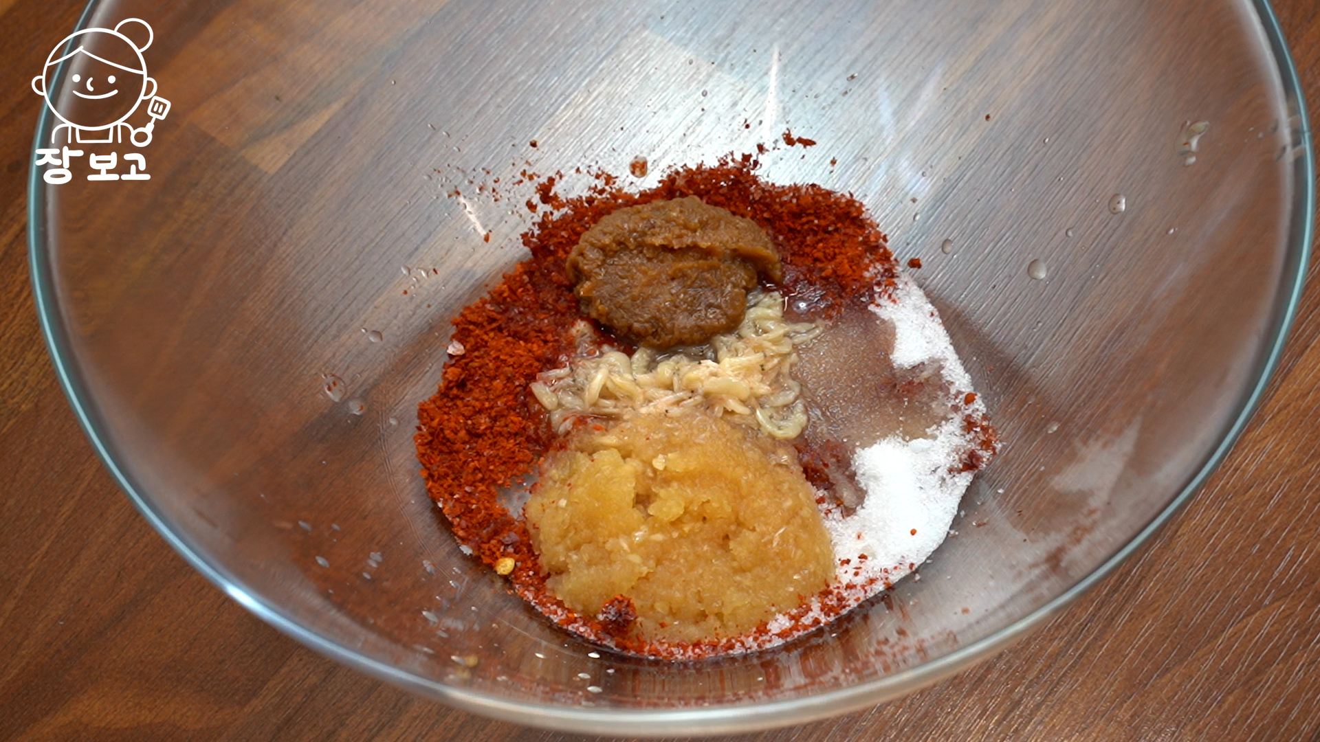 3. 우려지는 사이 고춧가루, 맛술, 설탕, 다진마늘, 새우젓, 된장 볼에 넣고 우려진 육수와 후추 약간 넣고 잘 섞는다. (파는 맛을 원한다면 설탕을 2큰술 더 넣으면 되지만, 쿰쿰한 맛만 잡으려면 레시피대로 1큰술만 넣으면 된다)