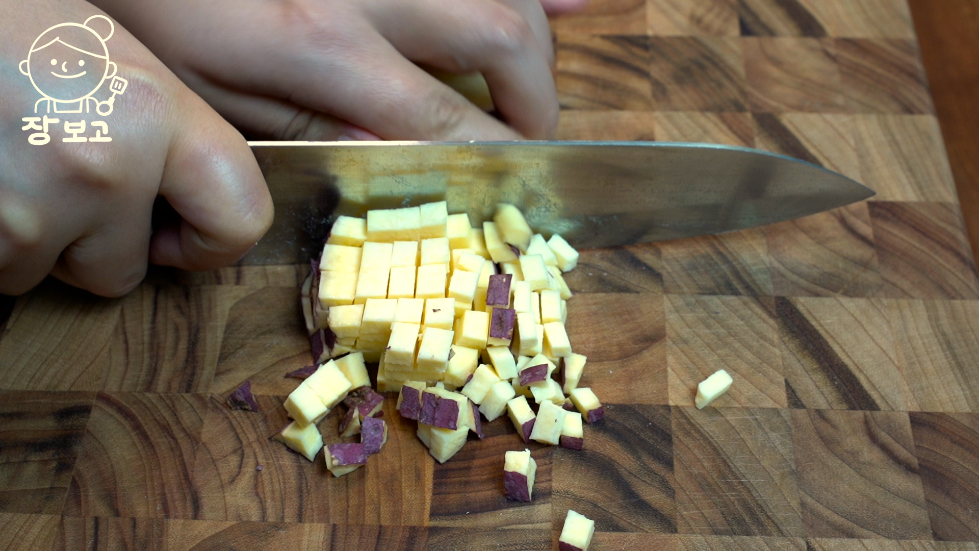 1. 고구마는 껍질 채 깨끗이 씻어서 딱딱한 꼭지를 제거하고 0.3cm 두께로 깍둑 썬다.
