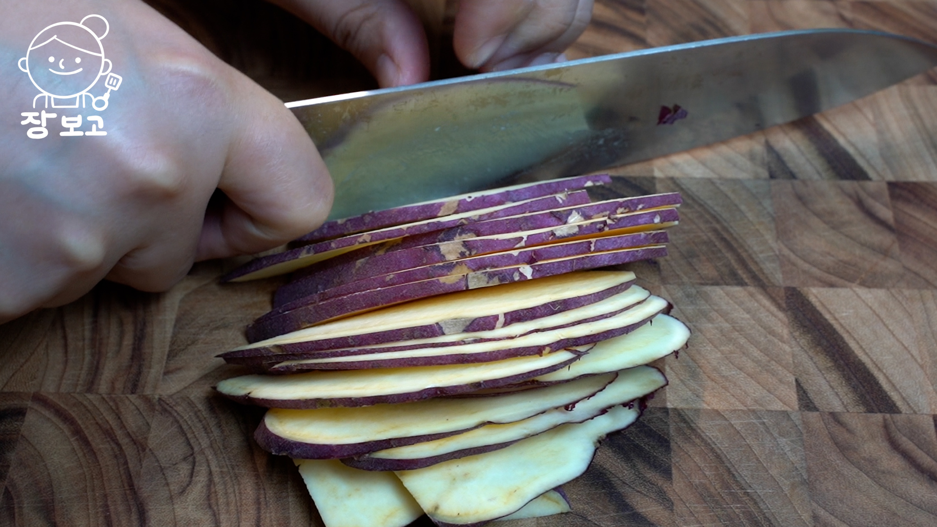 1. 고구마는 껍질 채 깨끗이 씻어서 딱딱한 꼭지를 제거하고 최대한 얇게 채 썬다.