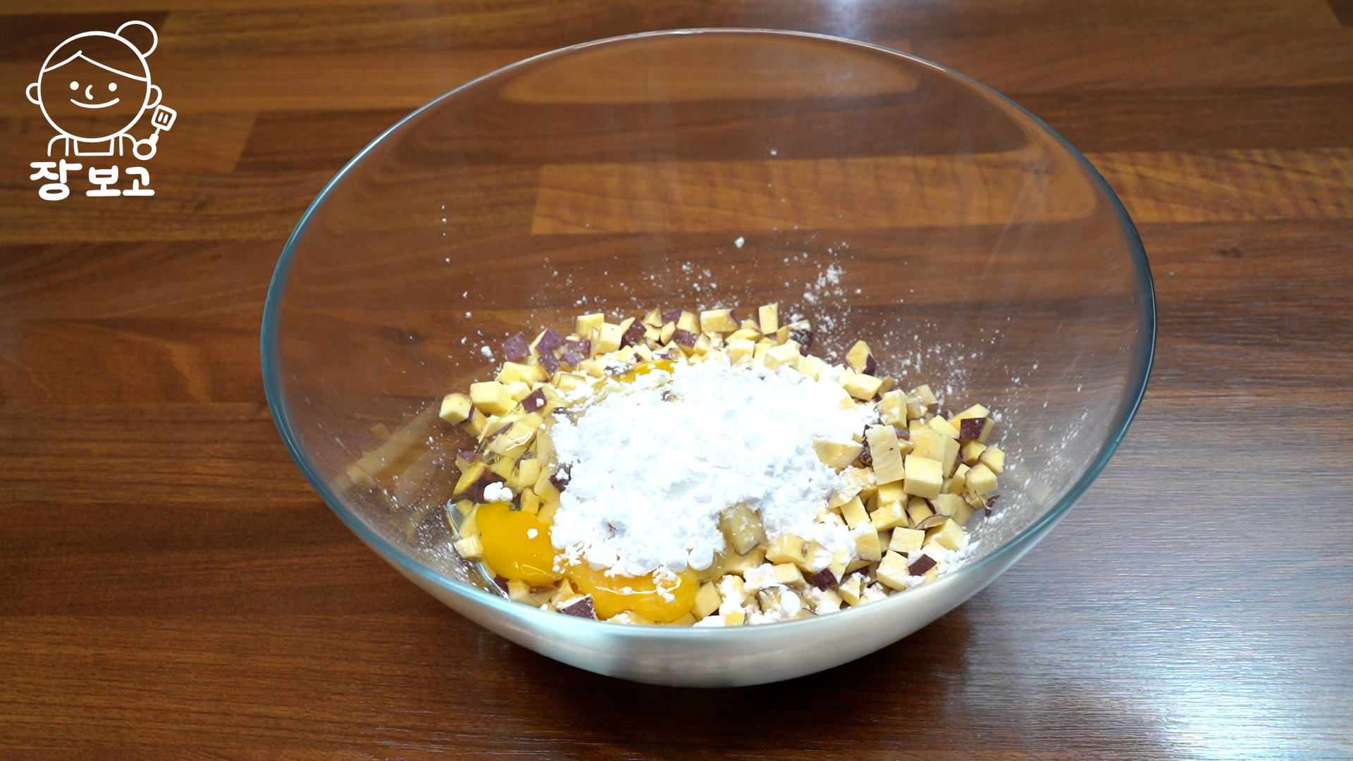 2. 볼에 고구마, 계란 1개, 감자전분 2큰술 넣고 잘 섞는다.
