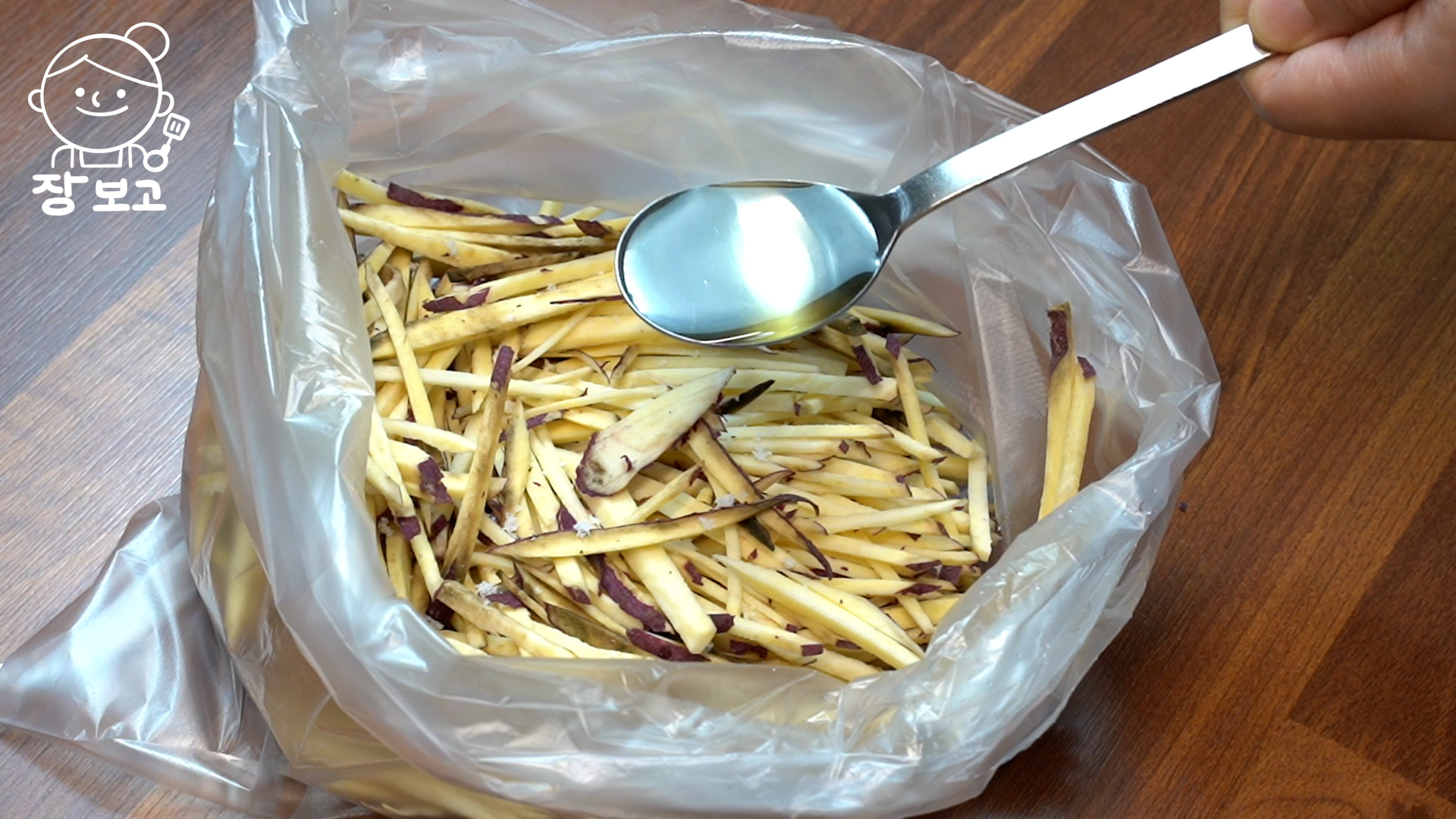 2. 비닐봉지에 채 썬 고구마, 맛소금 한 꼬집, 식용유 3큰술을 넣고 잘 흔든다.