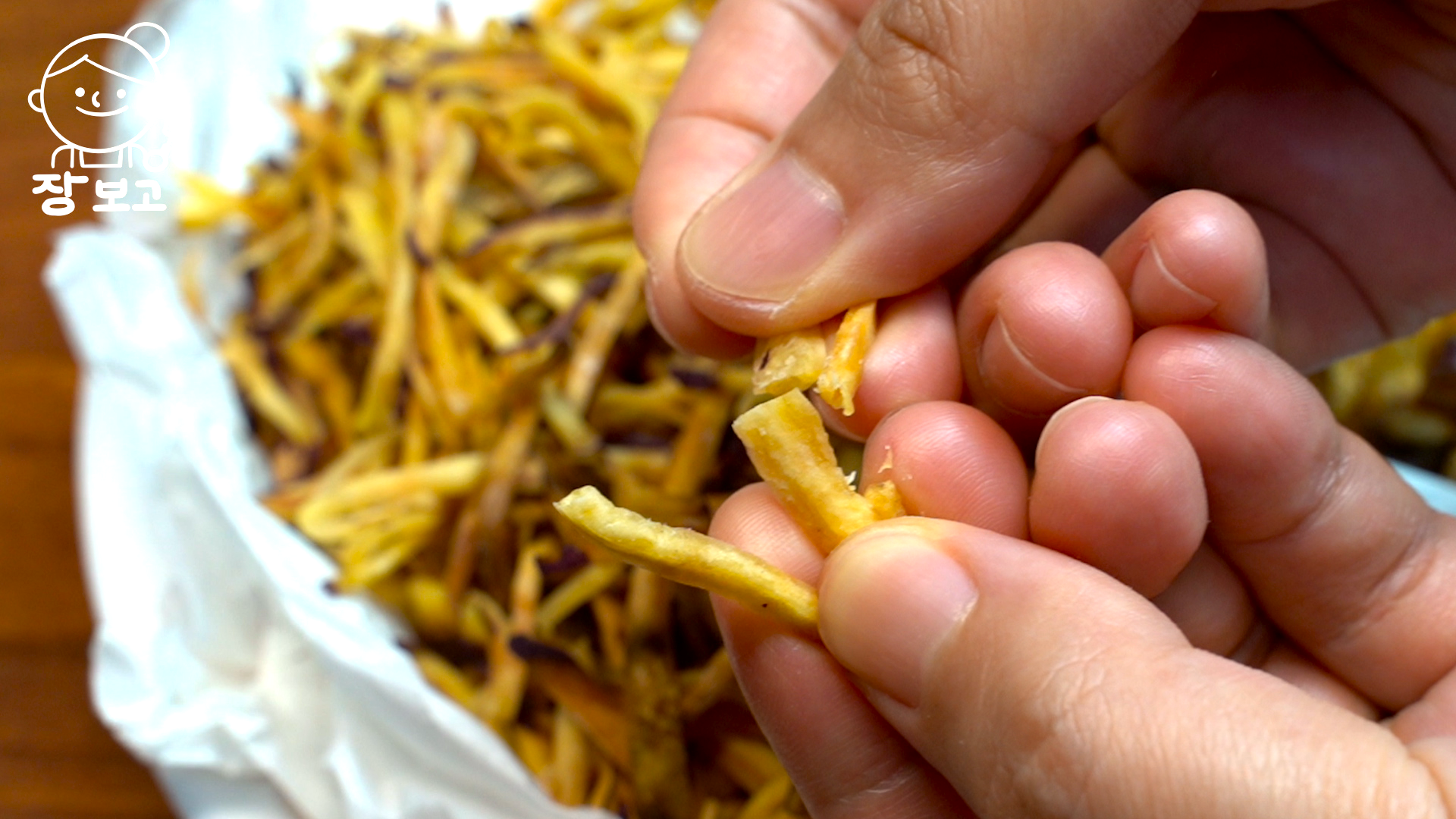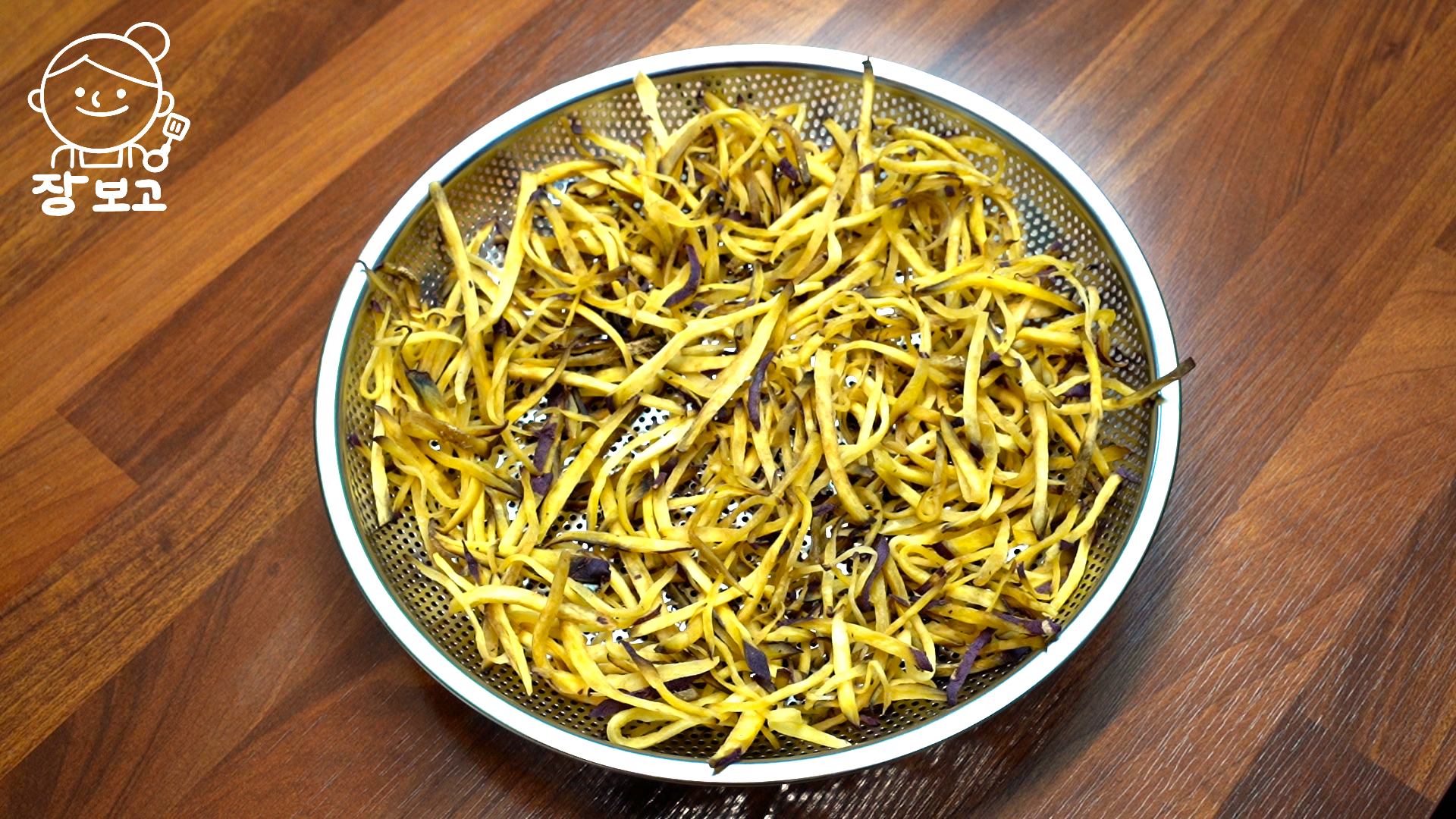5. 체망에 부어 한 김 식혀주면 바삭함이 살아난다. 전자레인지로 만드는 초간단 휴게소 고구마 스틱과자 완성!