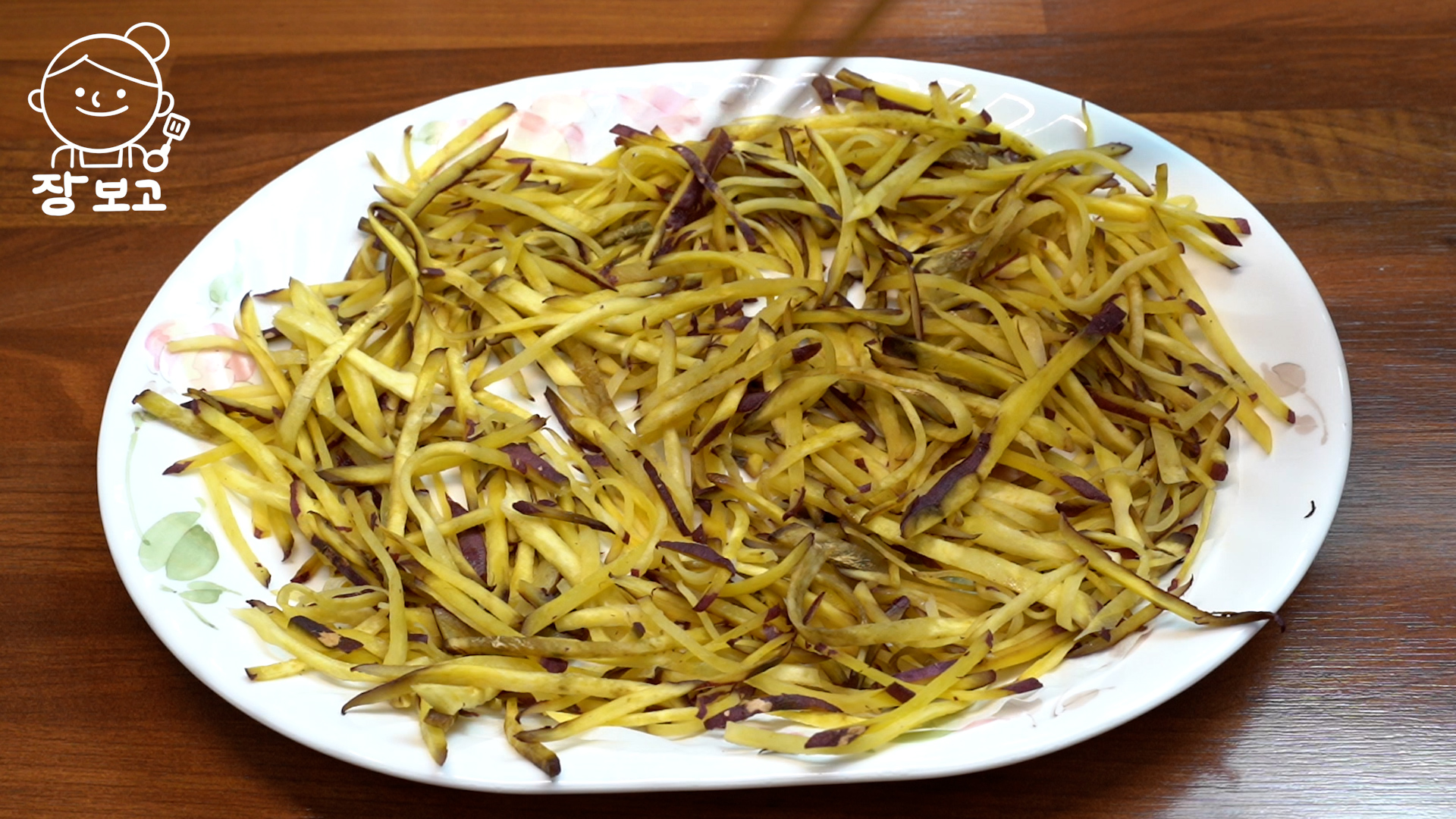 1. 고구마는 껍질 채 깨끗이 씻어서 딱딱한 꼭지를 제거하고 최대한 얇게 채 썬다.
