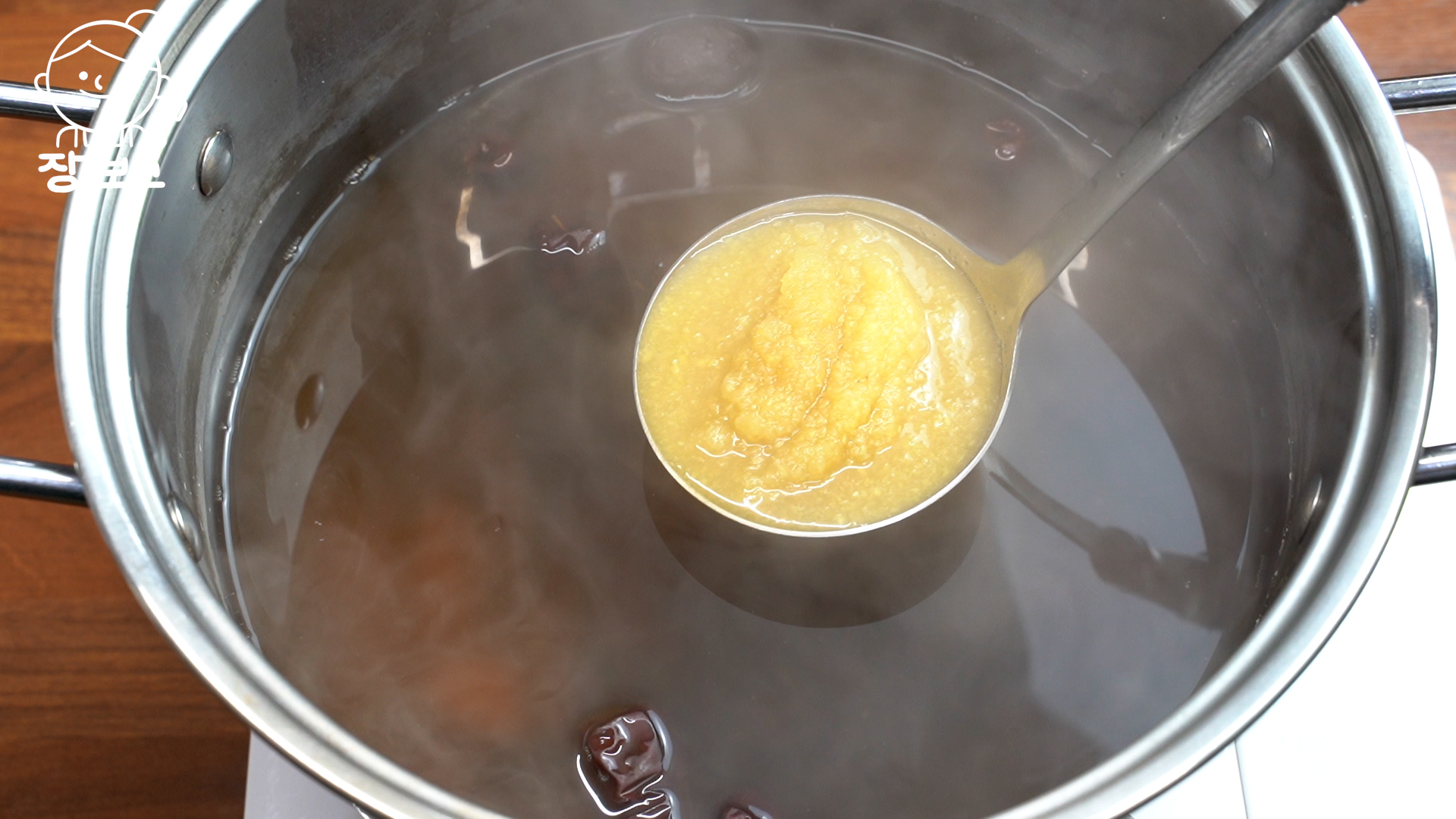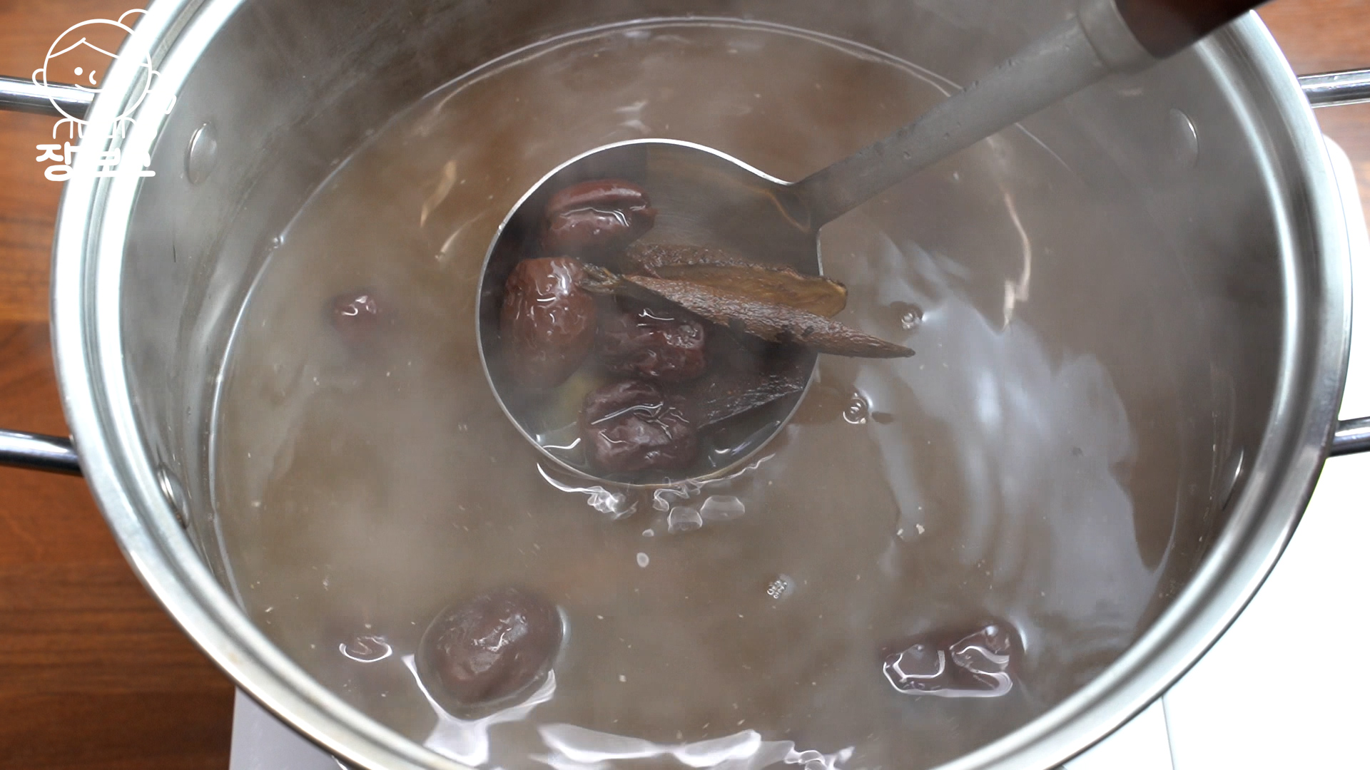 2. 계피와 건대추를 넣고 끓인 물에 생강청을 넣어 당도 맞춰주면 수정과 완성이다. 먹기 전에 곶감을 넣으면 더욱 달콤하다. 환절기 목감기가 뚝 떨어진다. 색이 밝은 건 흑설탕이 아닌 원당으로 사용했기 때문이다.