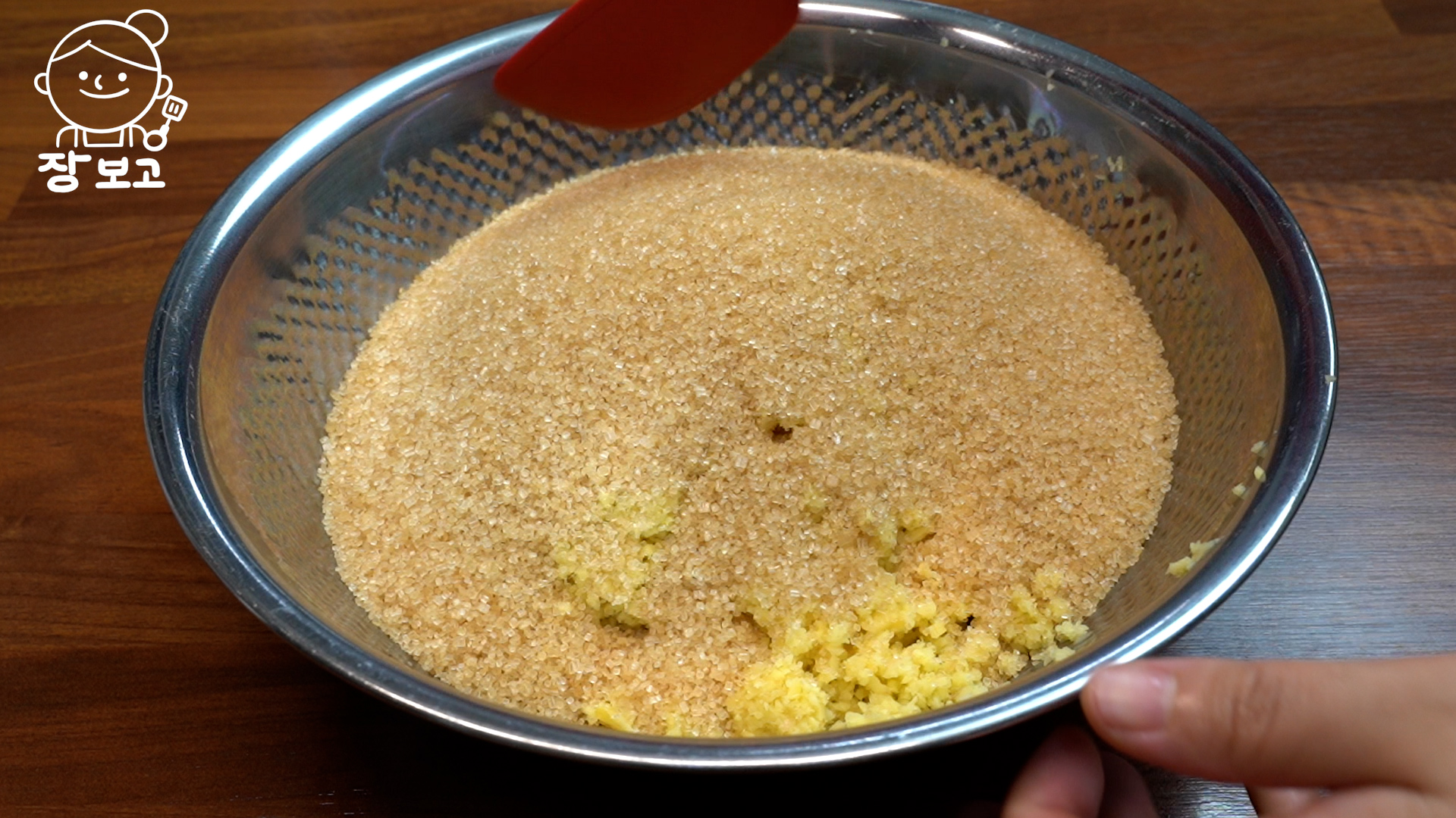 2. 볼에 담고 원당 (설탕) 300g을 부어 1시간 정도 오며 가며 섞어서 설탕을 완전히 녹여준다. 이렇게 하면 설탕에서 물이 생겨 수월하게 갈 수 있다.