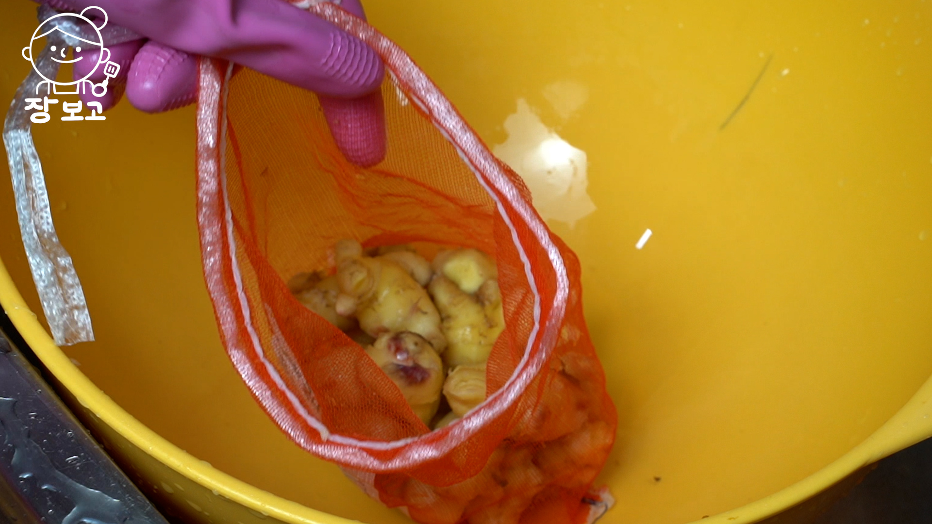 3. 양파망에 넣고 바락바락 주물러 준다. 햇 생강은 양파망이나 면장갑, 사용하지 않은 때수건으로 밀어도 껍질이 연해 잘 벗겨진다.