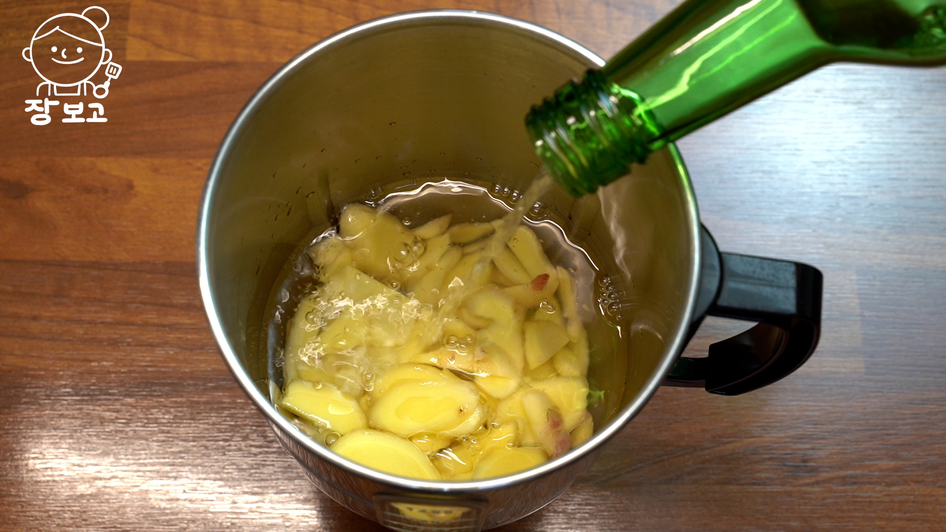1. 손질 후 남은 생강 180g과 소주 360ml를 믹서기에 넣고 곱게 간다. 청은 생강 1대 설탕 1 비율이며, 술은 생강 1대 술 2 비율이다.