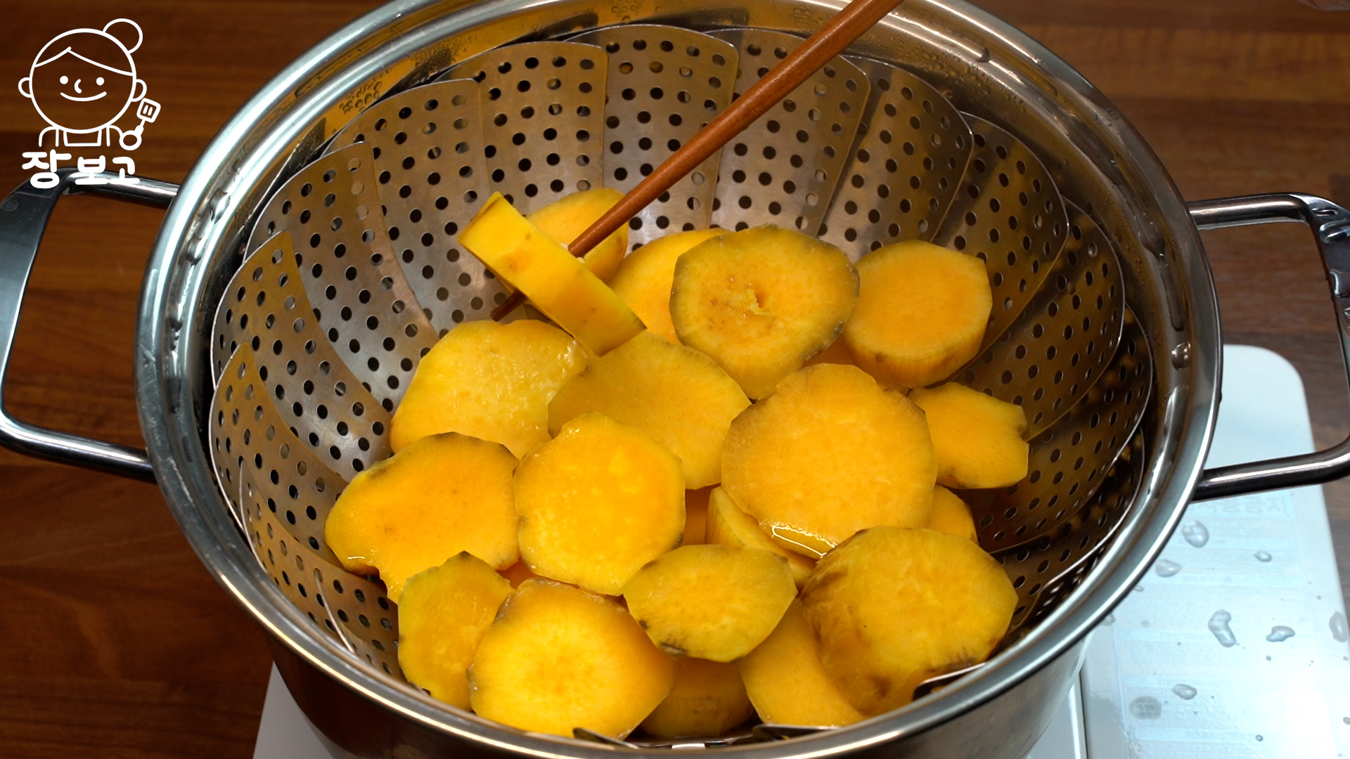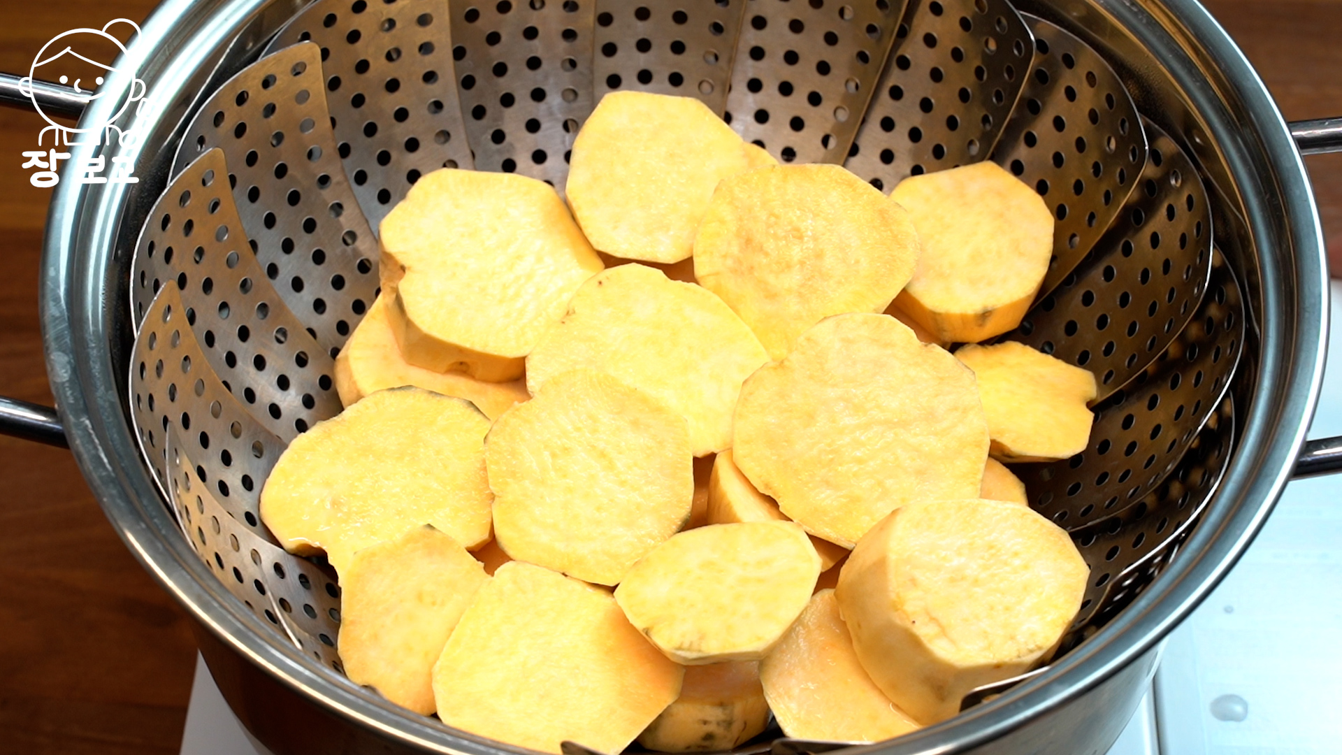 1. 고구마는 껍질을 벗기고 동그랗게 썰어서 삼발이에 올려 찐다.