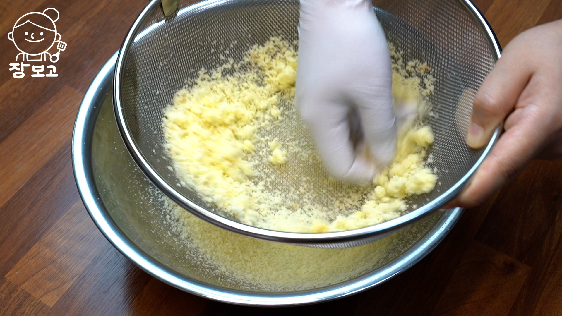 2. 사이에 카스텔라는 앞뒤 찐득한 갈색 부분을 칼로 잘라내고 흰 부분만 채에 곱게 내린다.