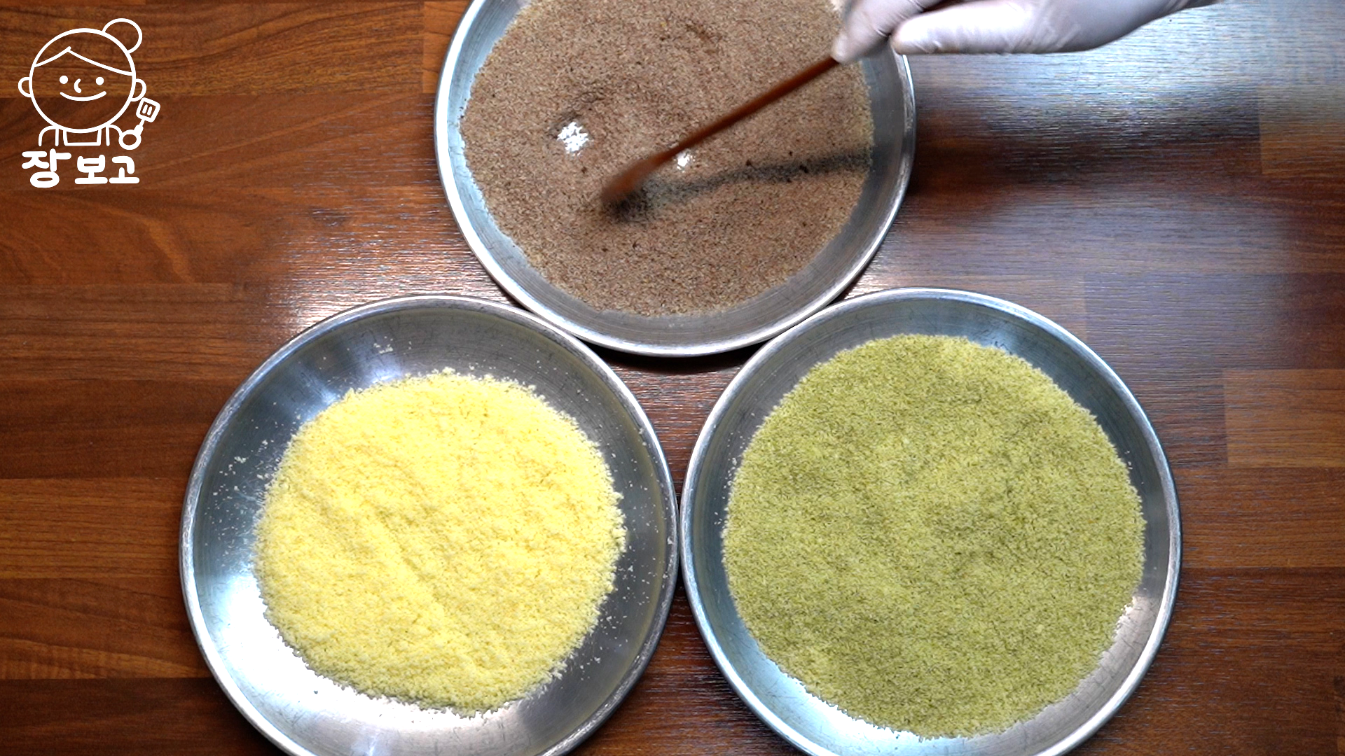 3. 카스텔라 가루는 그릇 3개로 나눈 뒤, 코코아 가루와 말차가루를 넣고 섞어 삼색을 만든다.
