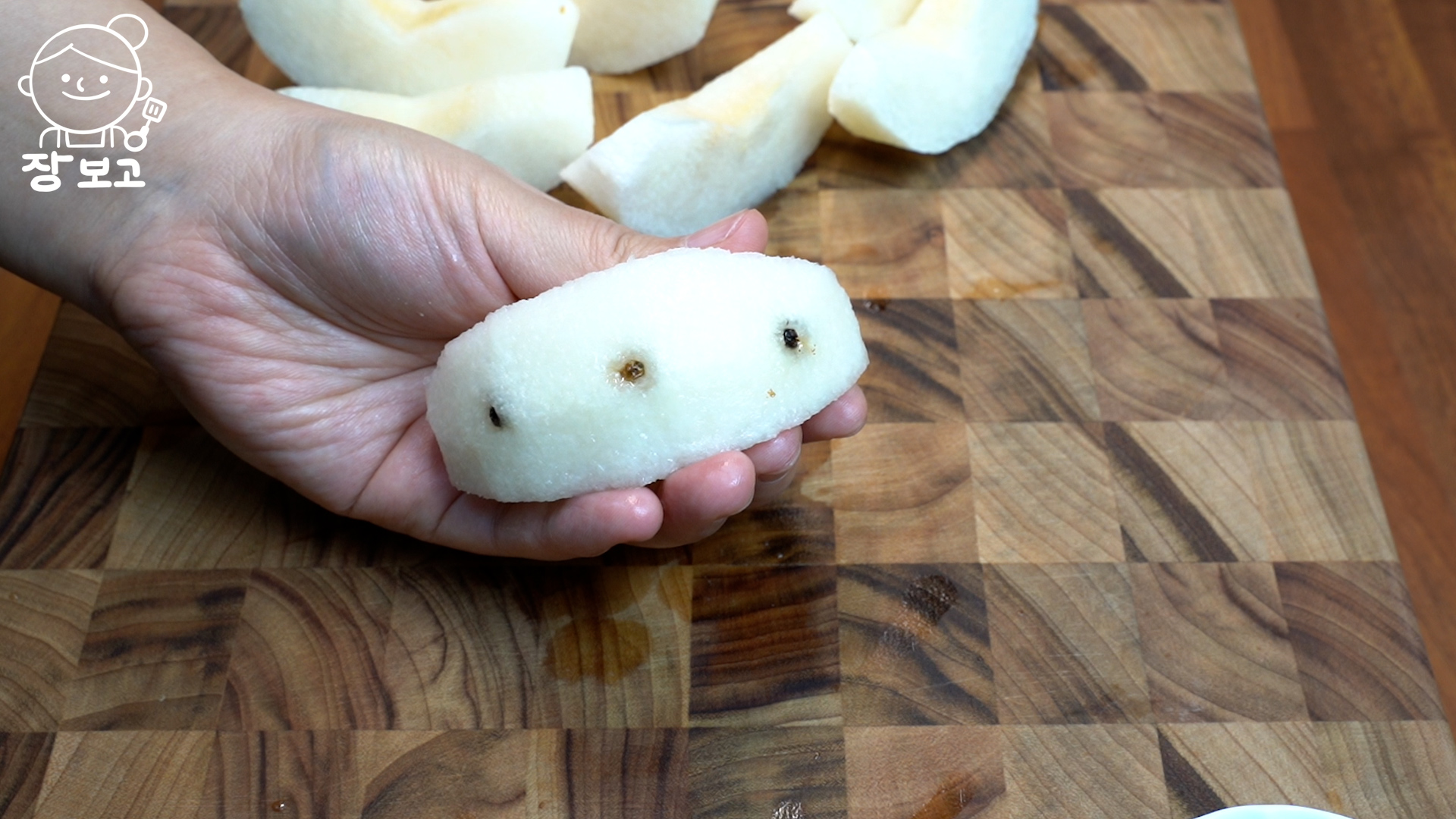2. 사이에 배를 썰어 씨와 껍질을 제거하고 통후추를 박아준다.