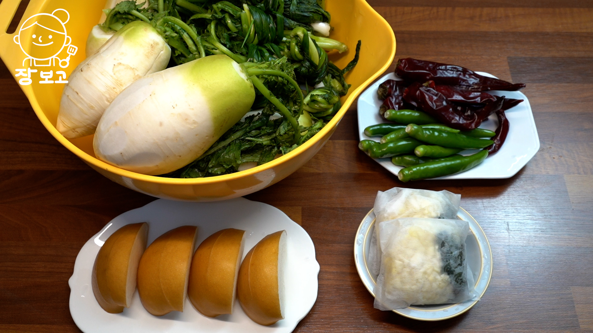다발무, 청갓, 쪽파, 건청각, 마늘, 생강, 청양고추, 건고추, 간수 뺀 천일염, 뉴슈가, 스텐대야