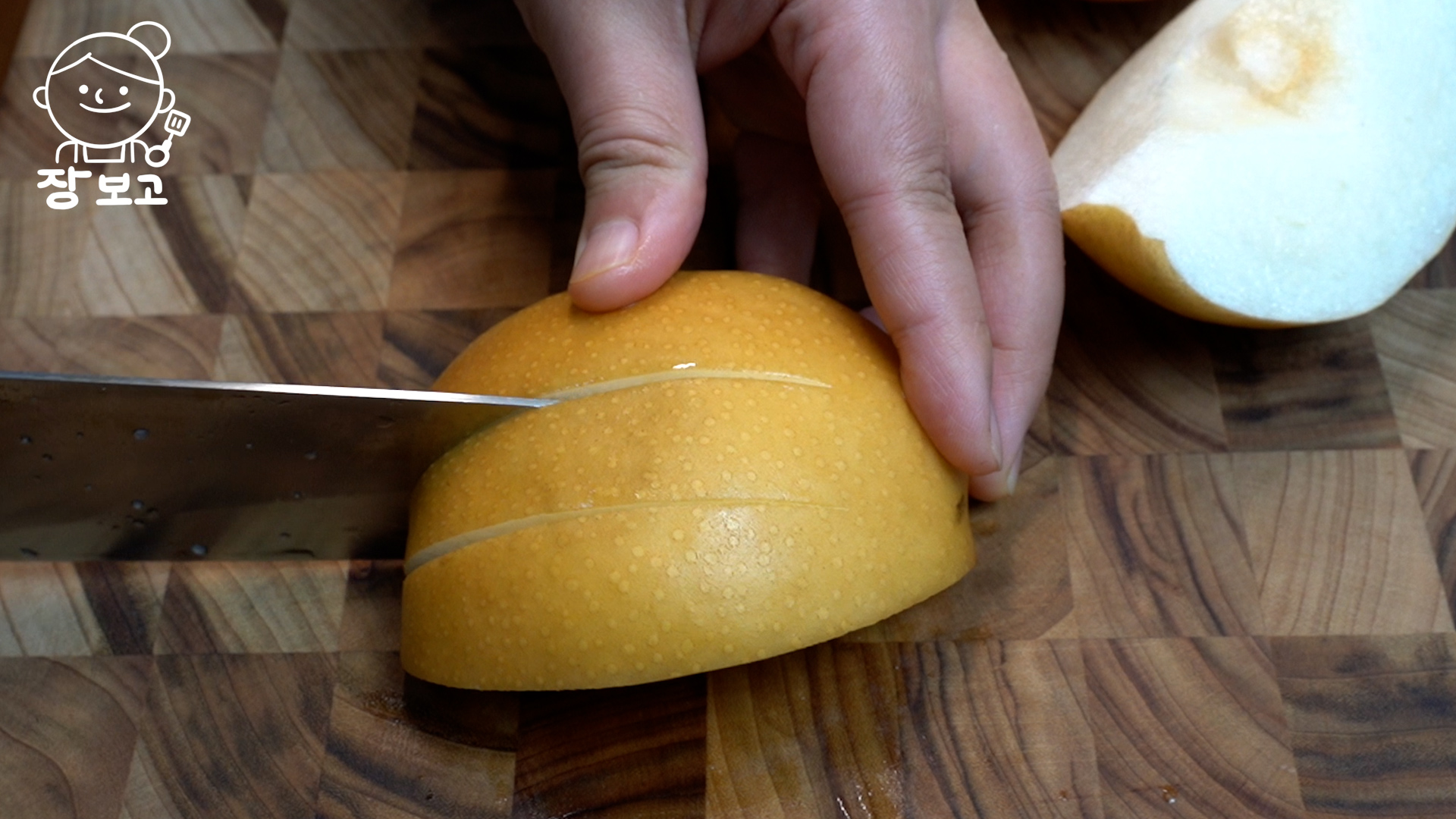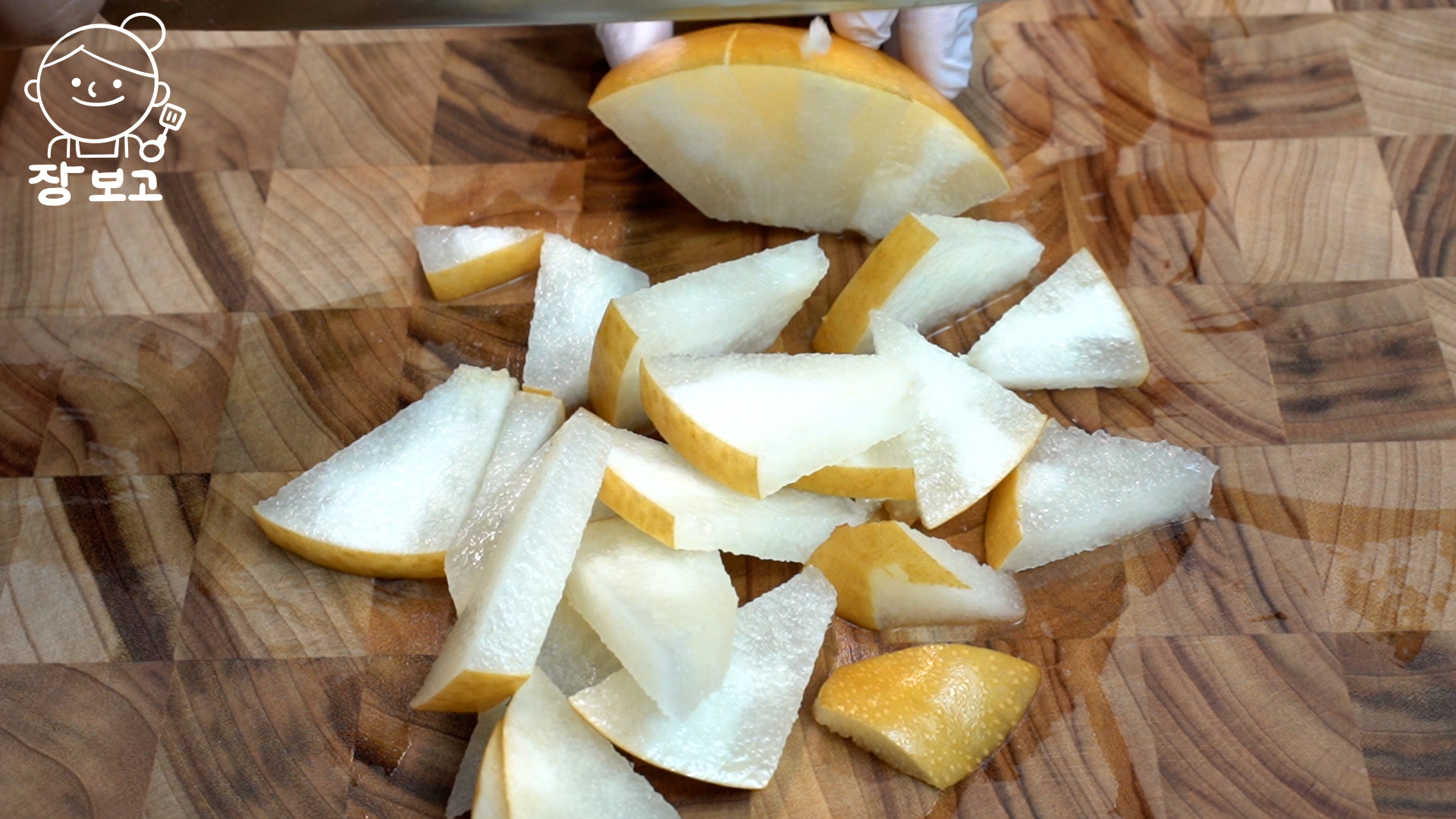 6. 배는 4등분으로 썰어 씨와 꼭지만 제거하고 끝부분에 칼집을 넣는다. 이렇게 하면 조각이 많지 않아 깔끔하고, 배 국물이 잘 우러나온다.