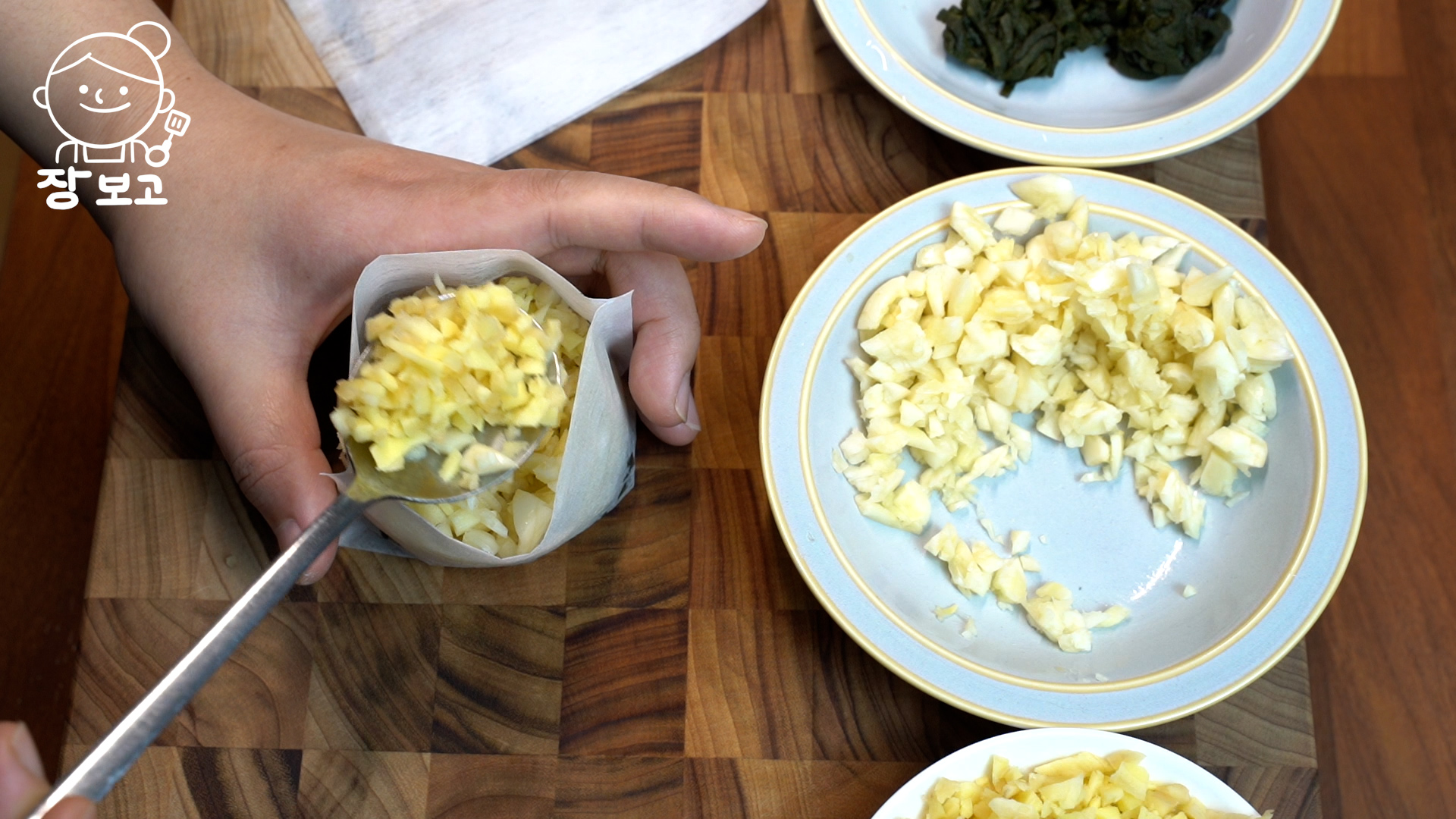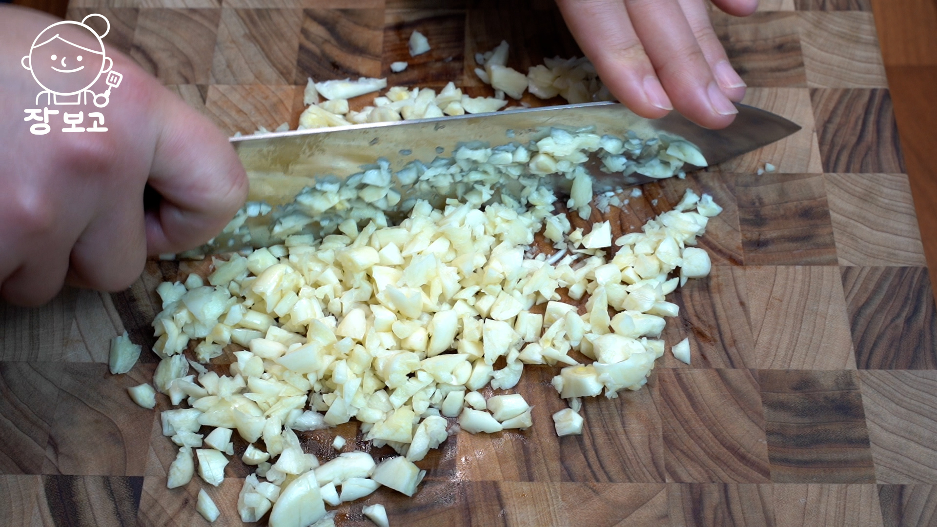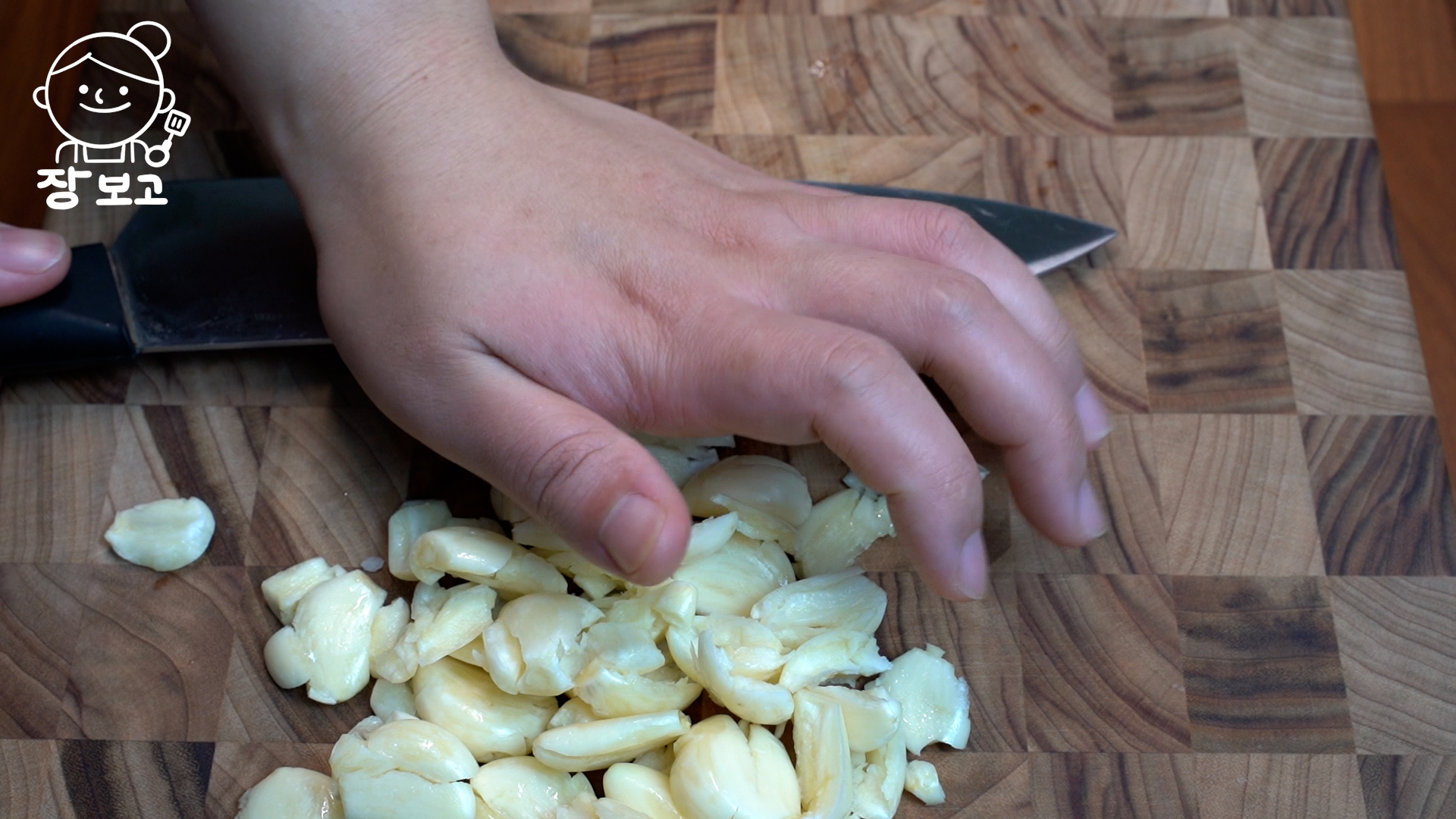 2. 마늘 35알 (100g)은 칼 옆면으로 으깬 뒤 굵게 다진다. (마늘과 생강은 미리 다져놓은 것보다 생으로 사서 바로 다져야 향과 맛이 깔끔하고 좋다)