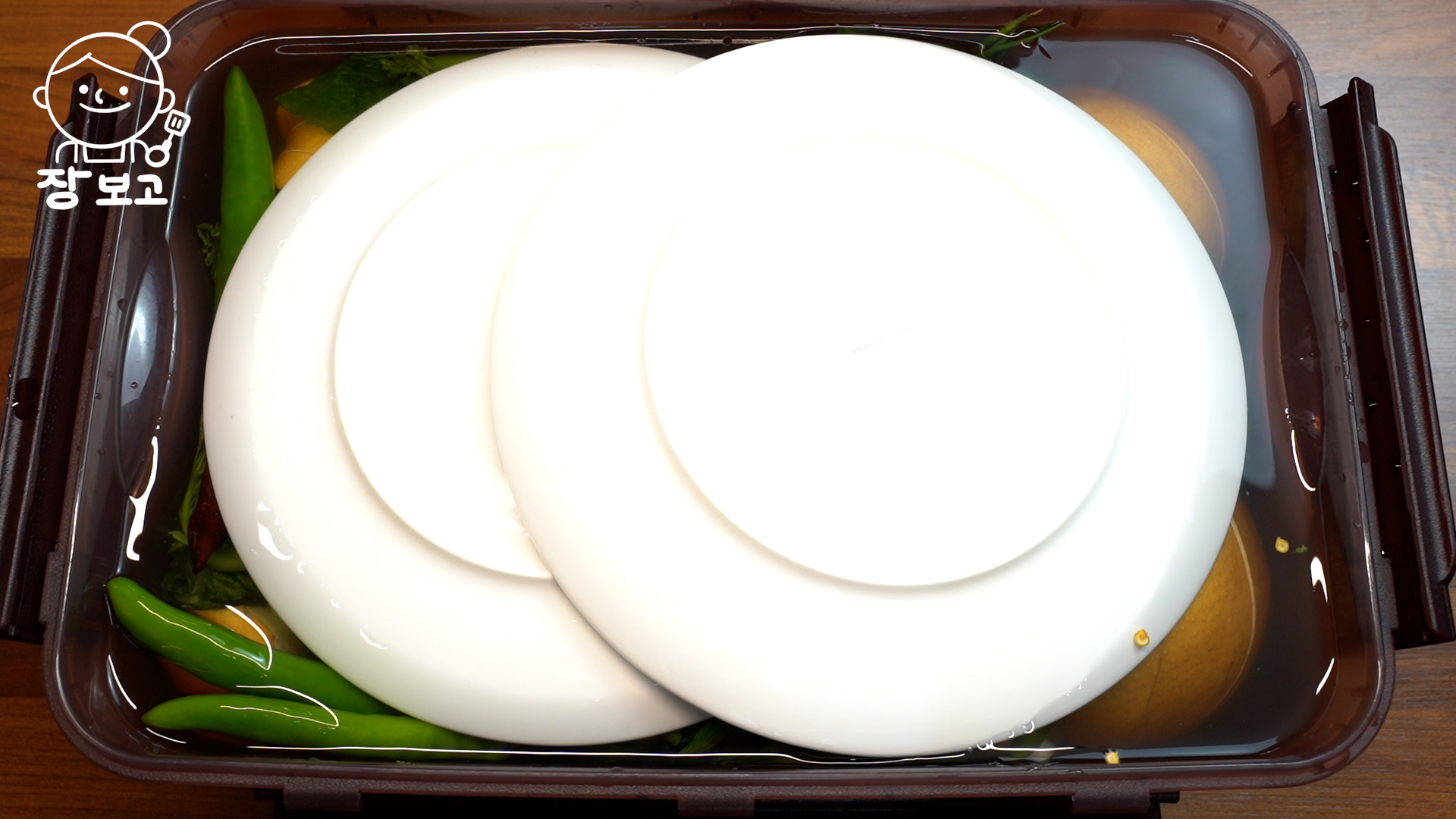 3. 절임물을 붓고 접시로 눌러 동치미재료가 침수되게 한다. 공기에 노출되지 않아야 골마지가 끼지 않고 오래 먹을 수 있다.