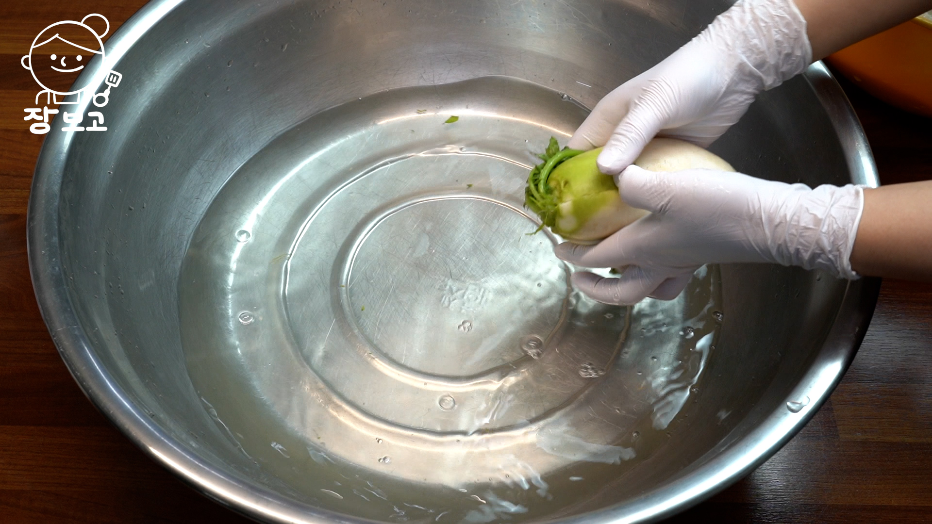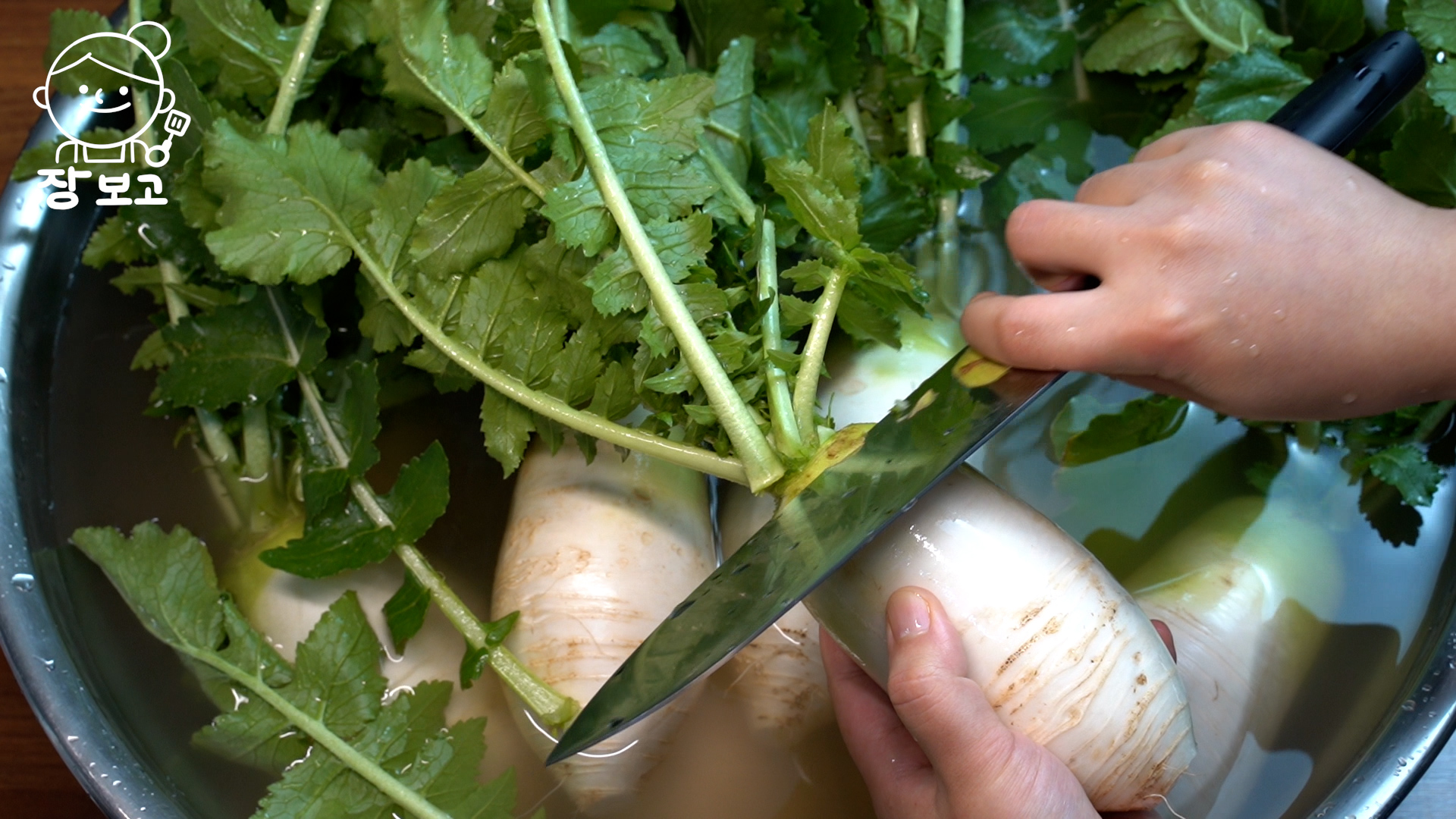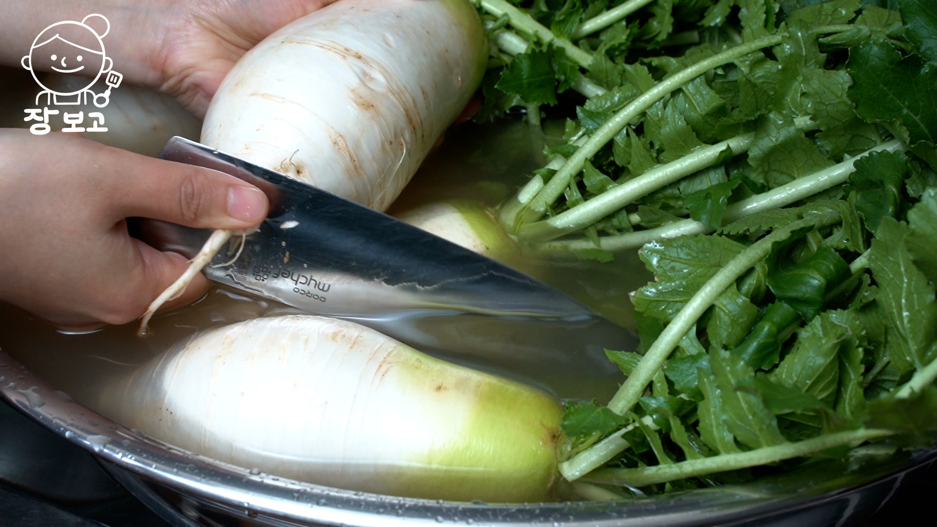 2. 불려지면 수세미가 아닌 손으로 깨끗이 씻어준다. 무 뿌리를 제거하고, 지저분한 부분은 칼로 제거한다. 무와 무청 사이에 흙이 끼어 있으니 칼로 홈을 파낸다.