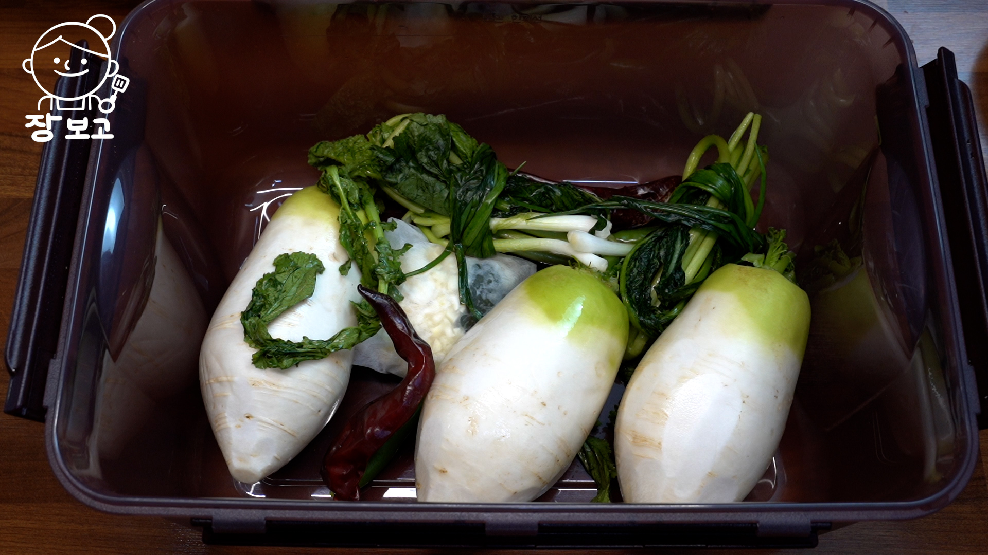 1. 김치 통에 다시 백, 무, 청갓 쪽파, 청양고추, 건고추 순으로 켜켜이 넣어준다.