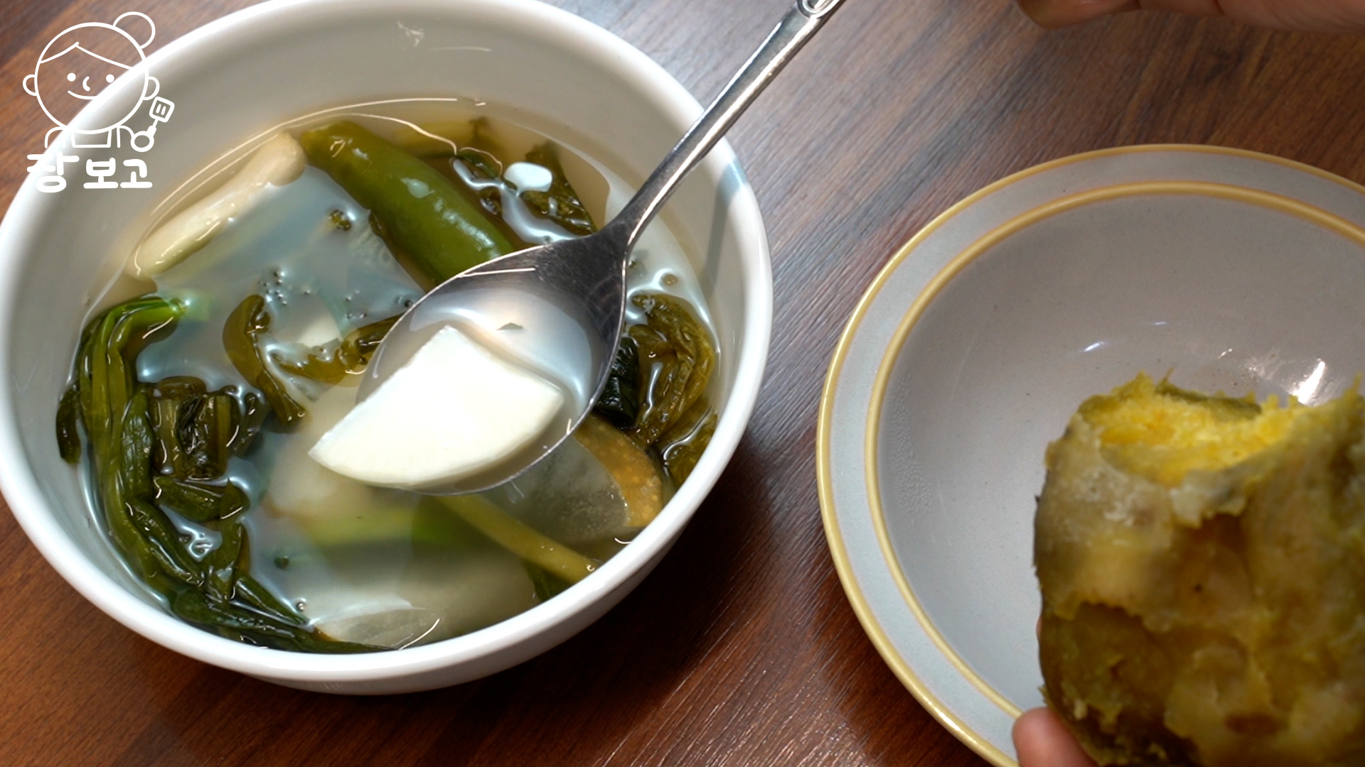 쌀쌀한 날씨에, 뜨끈한 고구마와 시원한 동치미 한 그릇.