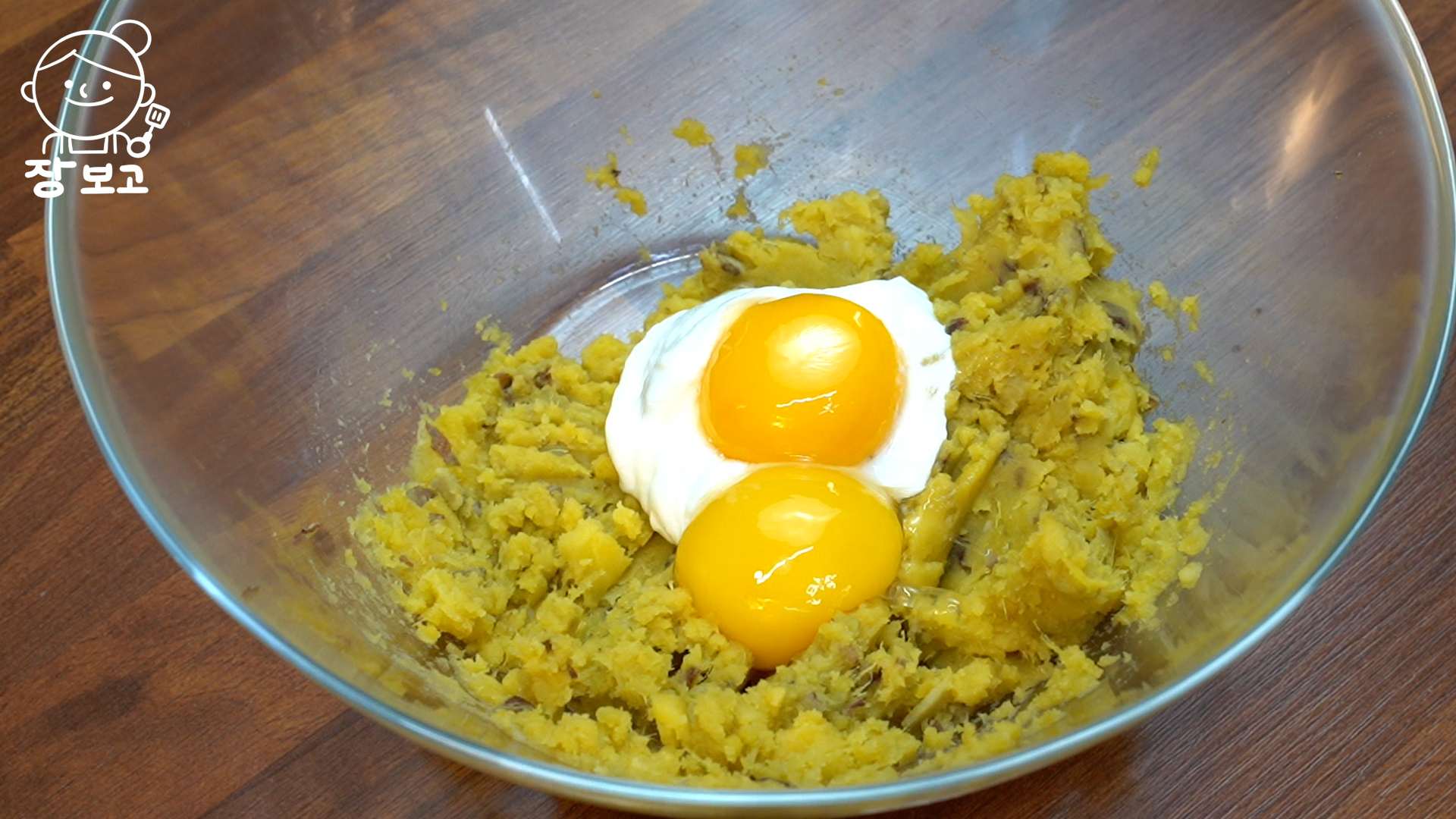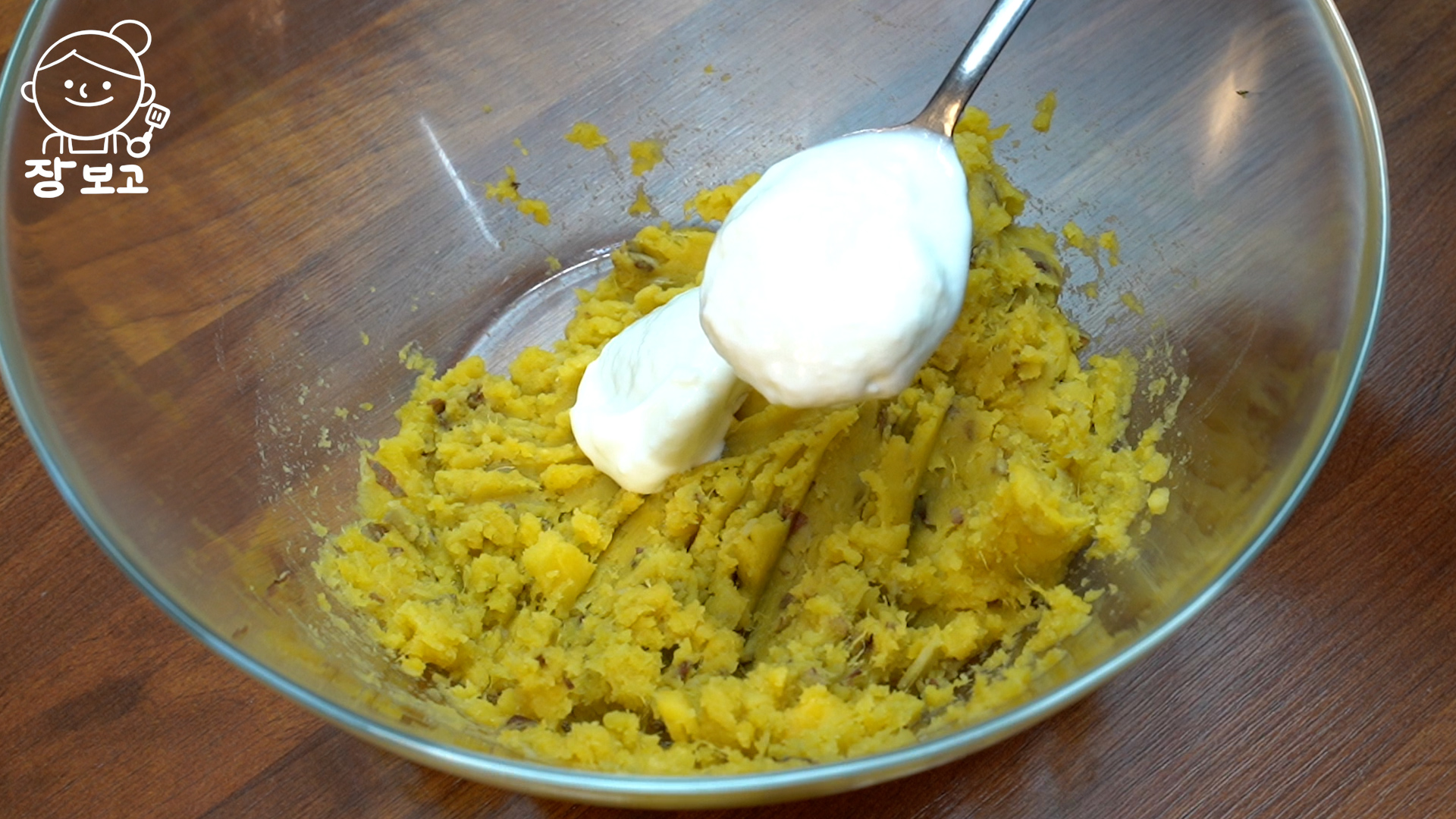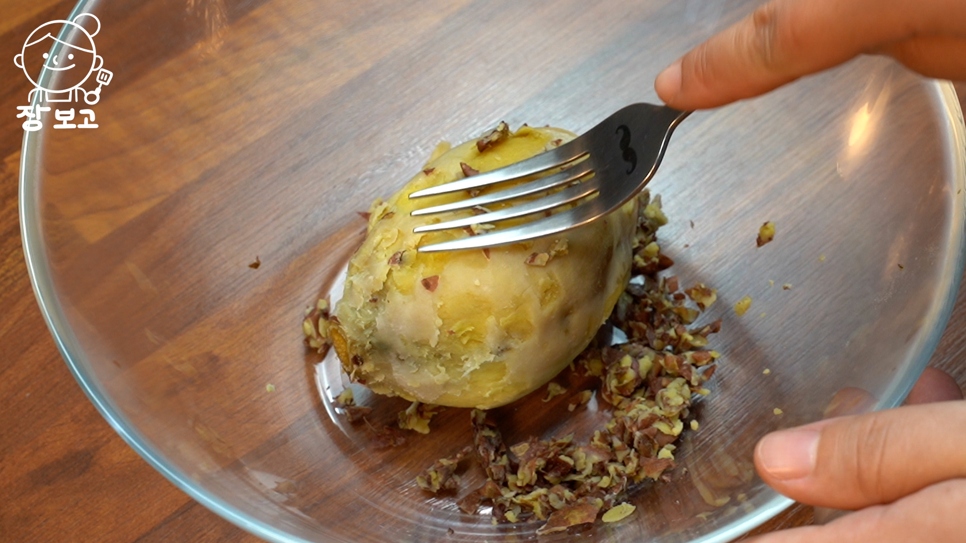 2. 볼에 찐 고구마, 다진 껍질을 넣고 포크로 곱게 으깨어 준다.