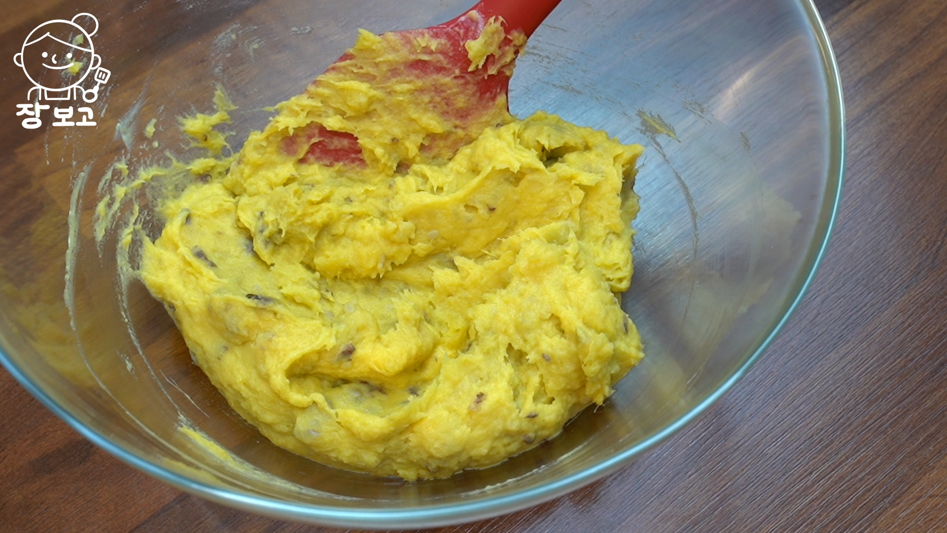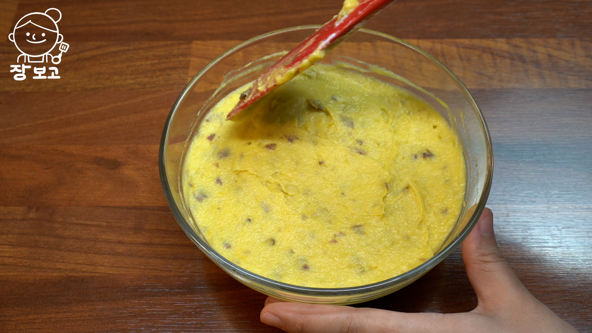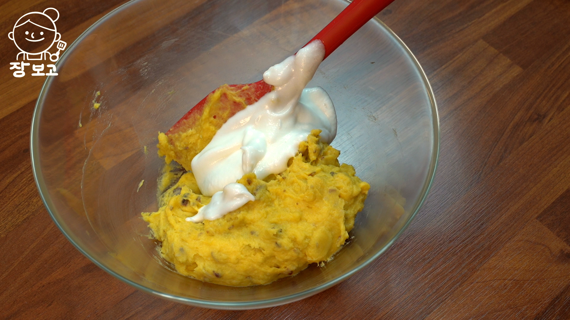 5. 머랭을 고구마 반죽에 3번에 나눠 넣는다. 거품이 꺼지지 않게 살살 섞어 준다.