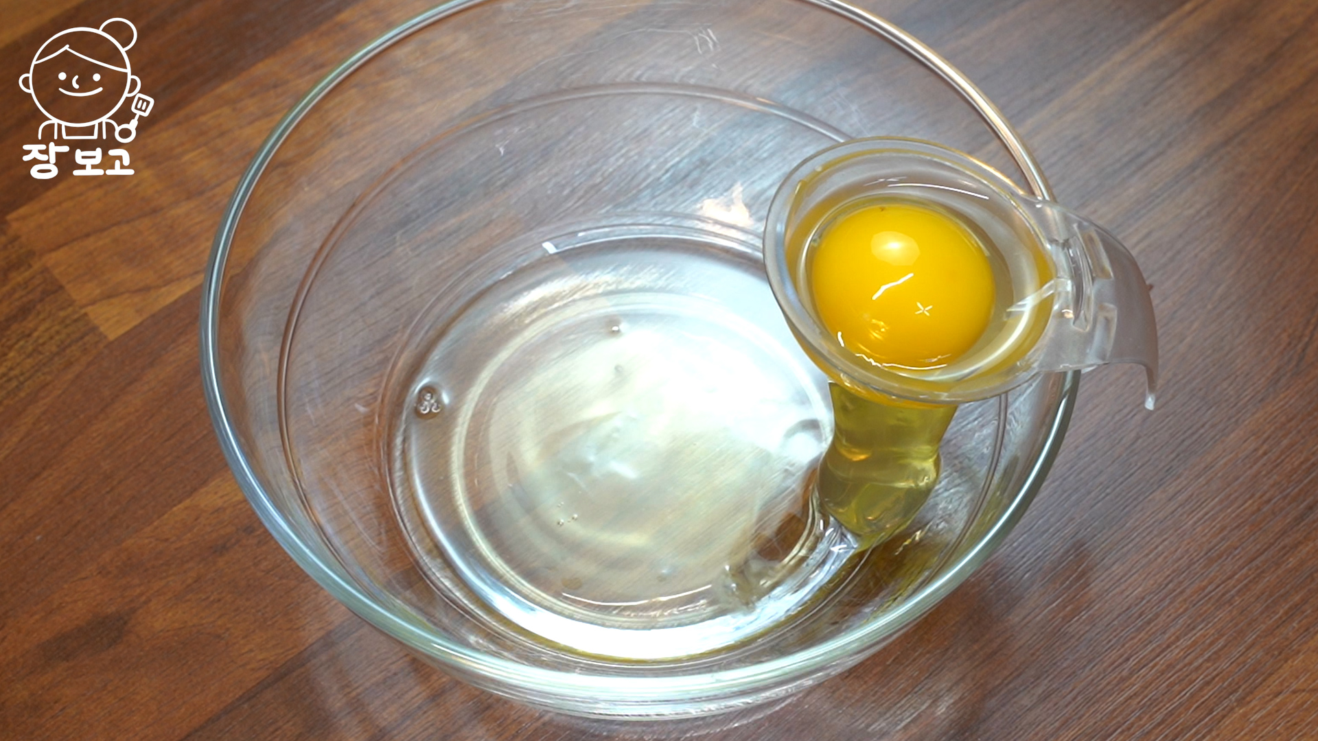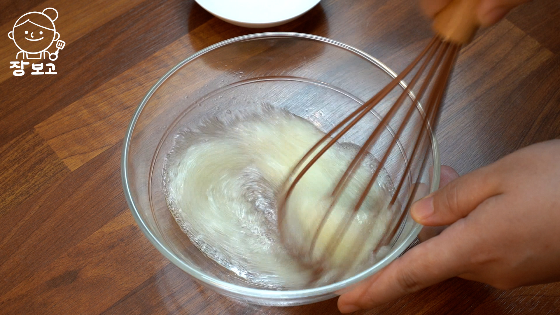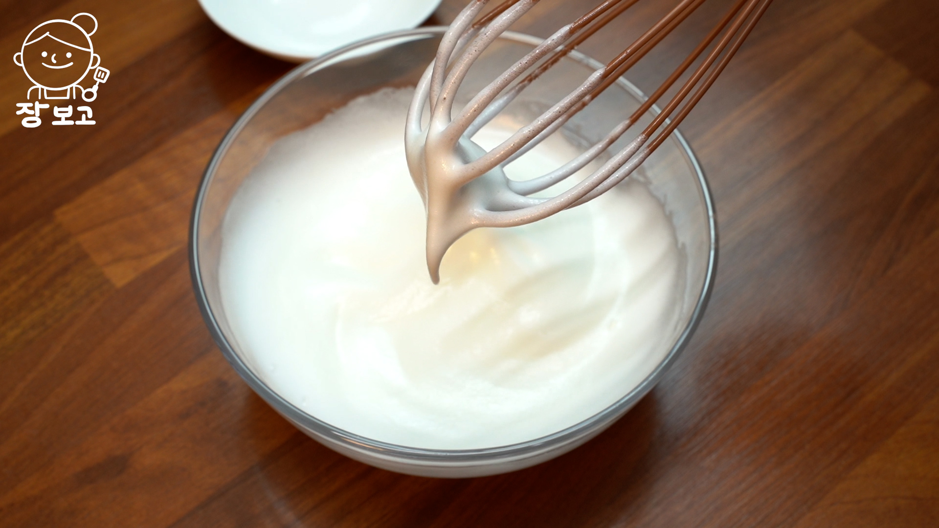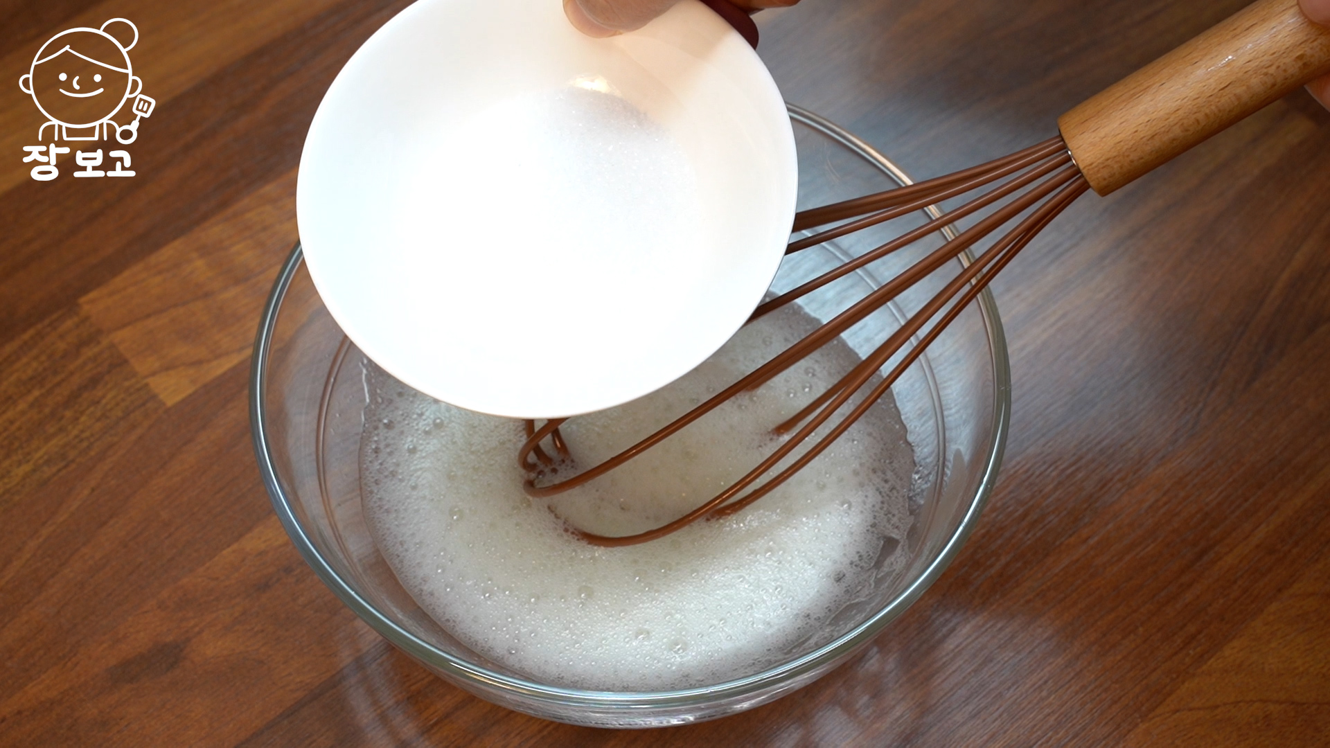 4. 계란 흰자를 거품기로 열심히 젓는다. 설탕 2큰술을 3번에 나눠 넣으며 단단한 머랭을 만들어 준다.