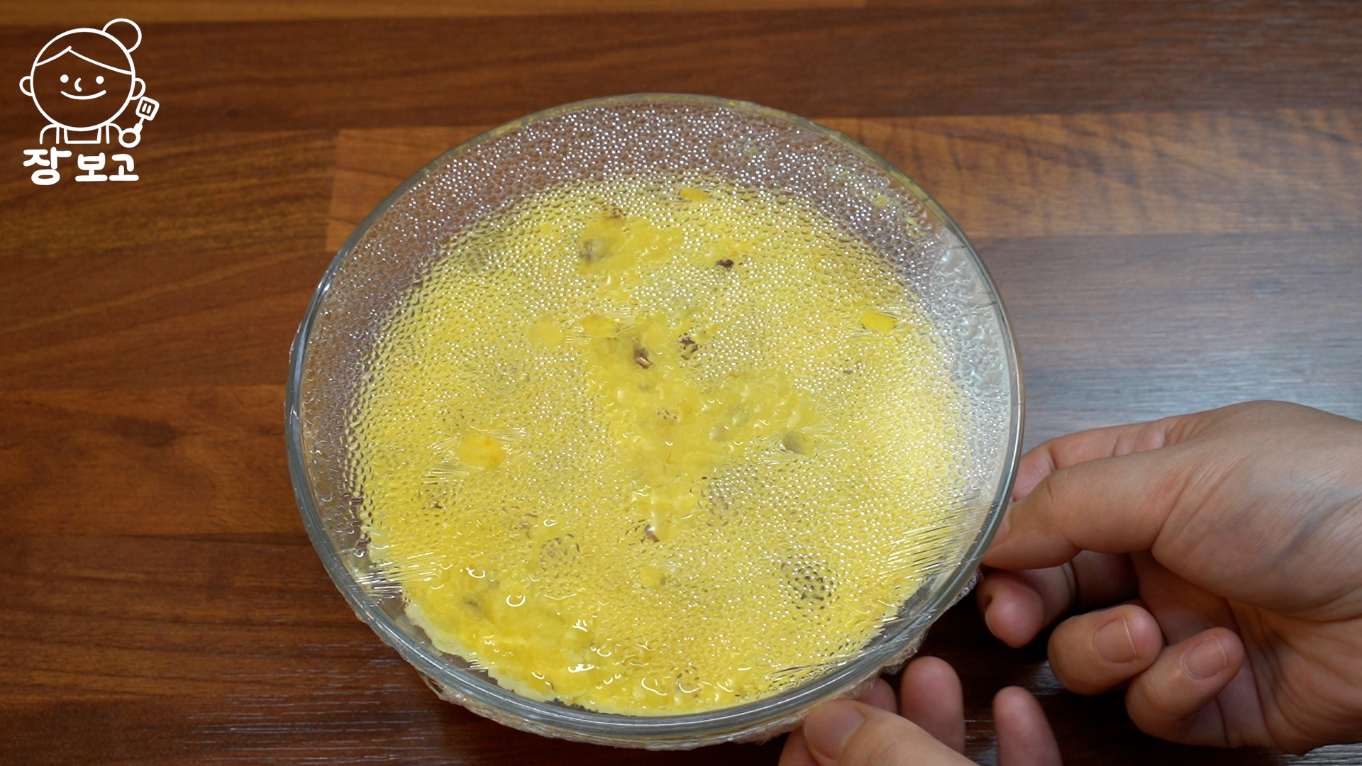 7. 반죽을 넣고 윗면을 평평하게 정리한 뒤 랩을 씌우고 구멍을 뚫어 전자레인지 6분 돌린다.