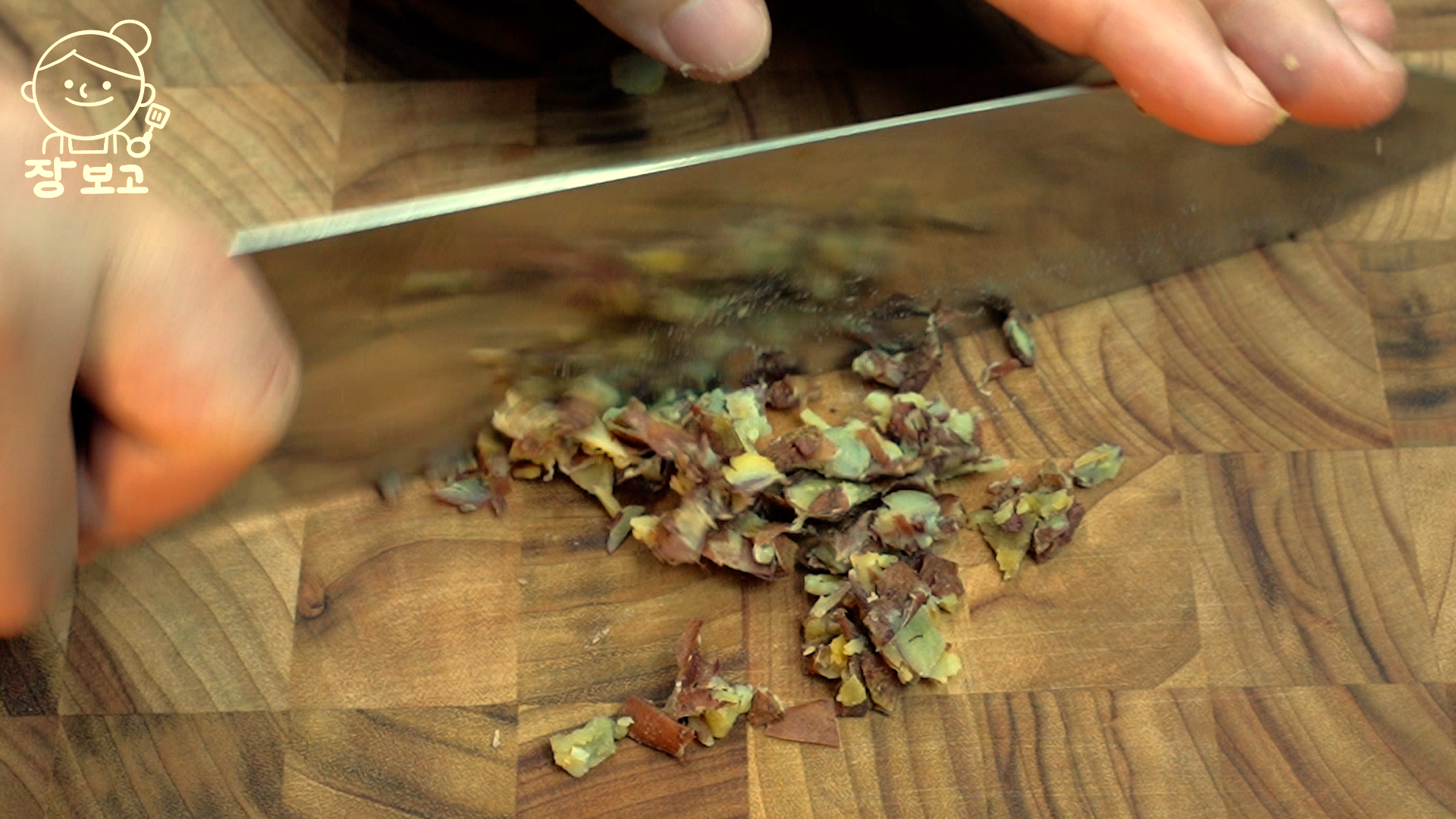 1. 찐 고구마는 껍질을 벗긴다. 벗긴 껍질은 칼로 잘게 다져준다. 껍질을 버려도 상관없지만, 껍질에 노화를 방지하는 성분이 들어있어 모두 넣어 먹을 예정
