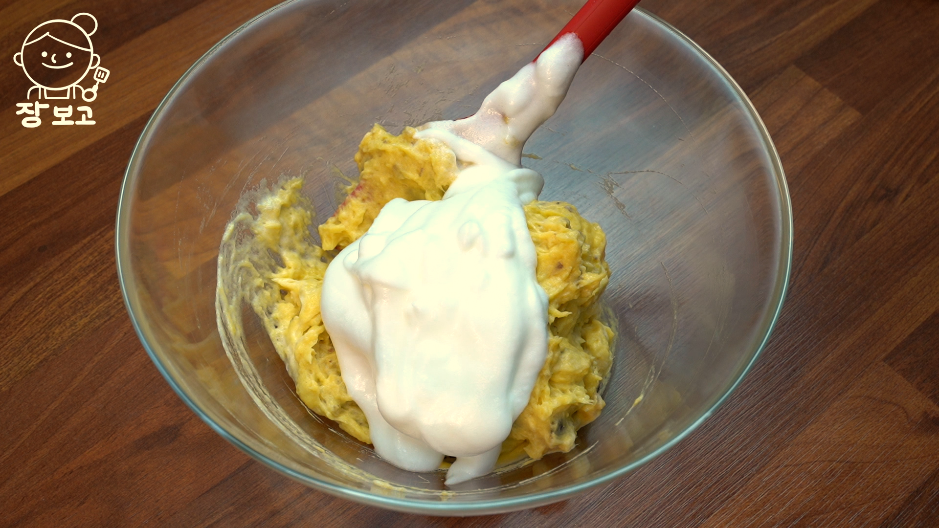 5. 머랭을 고구마 반죽에 3번에 나눠 넣는다. 거품이 꺼지지 않게 살살 섞어 준다.