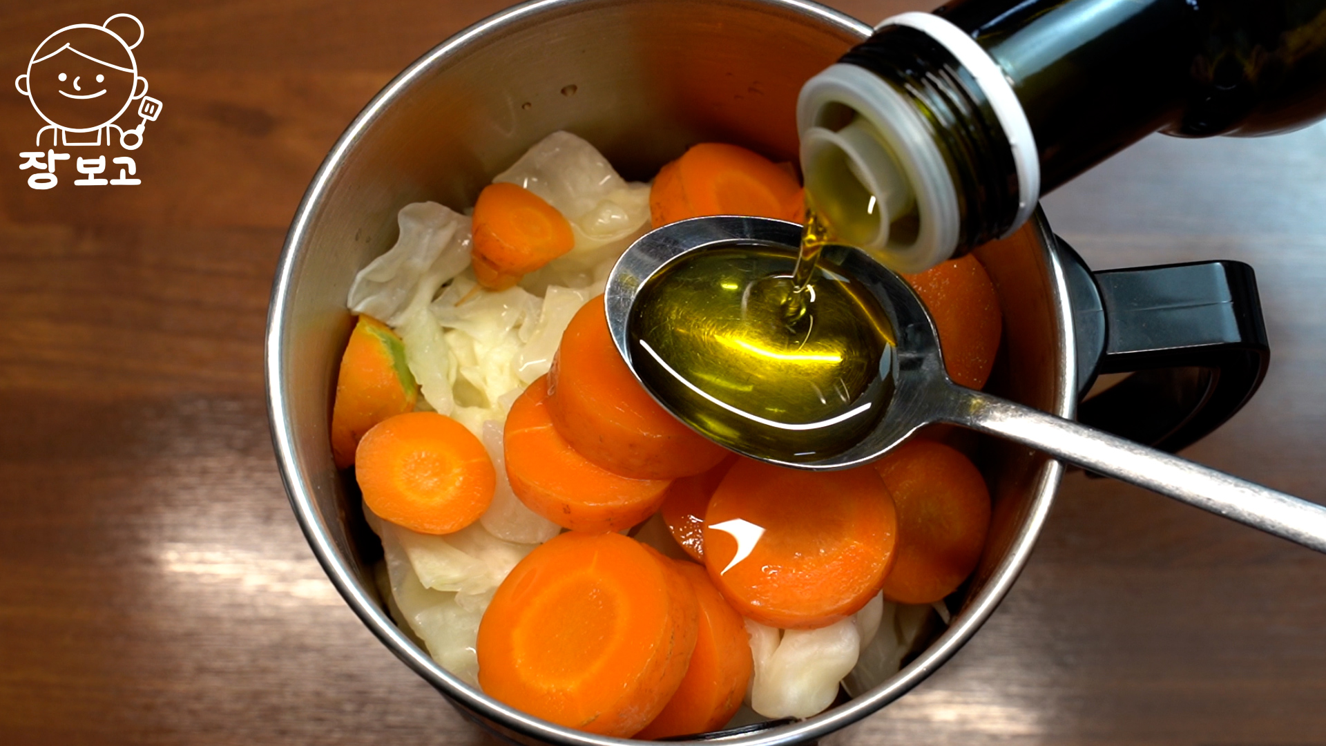 5. 믹서기에 사과 -> 양배추 -> 당근 -> 물 한 컵 -> 엑스트라 버진 올리브오일 2T을 차례대로 넣고 곱게 간다.