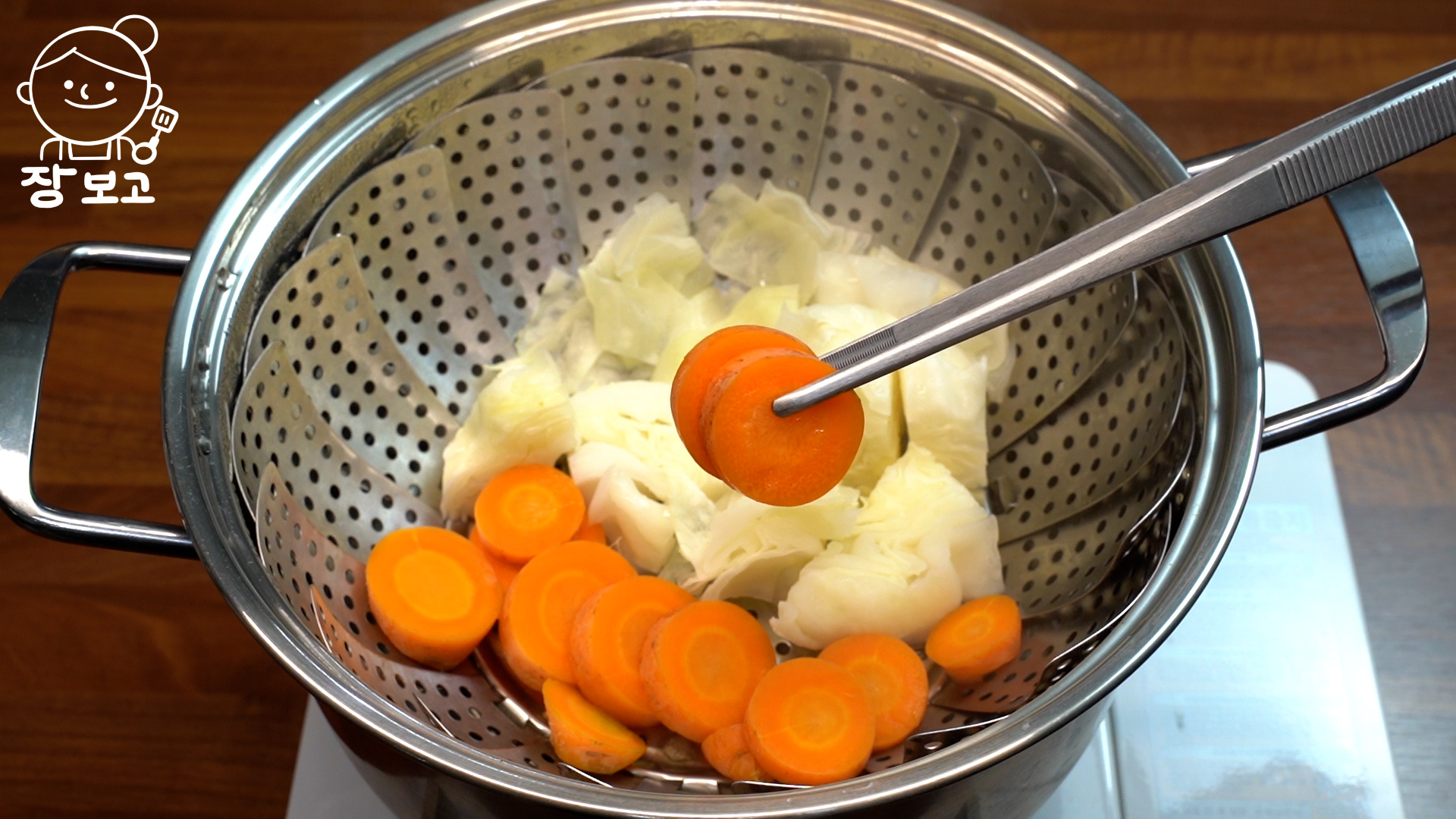 3. 찜기에 물 올리고 양배추와 당근을 넣어 4분간 강불로 찐다.
