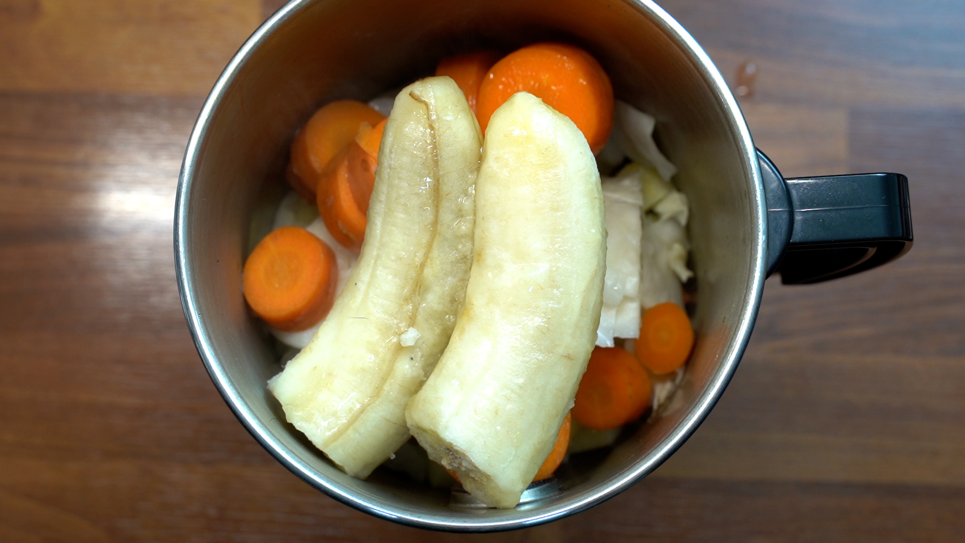 매번 아침마다 이렇게는 번거로우니, 양배추와 당근을 3~4일치 미리 쪄놓고 야침에는 사과만 넣어 갈면 편하다.