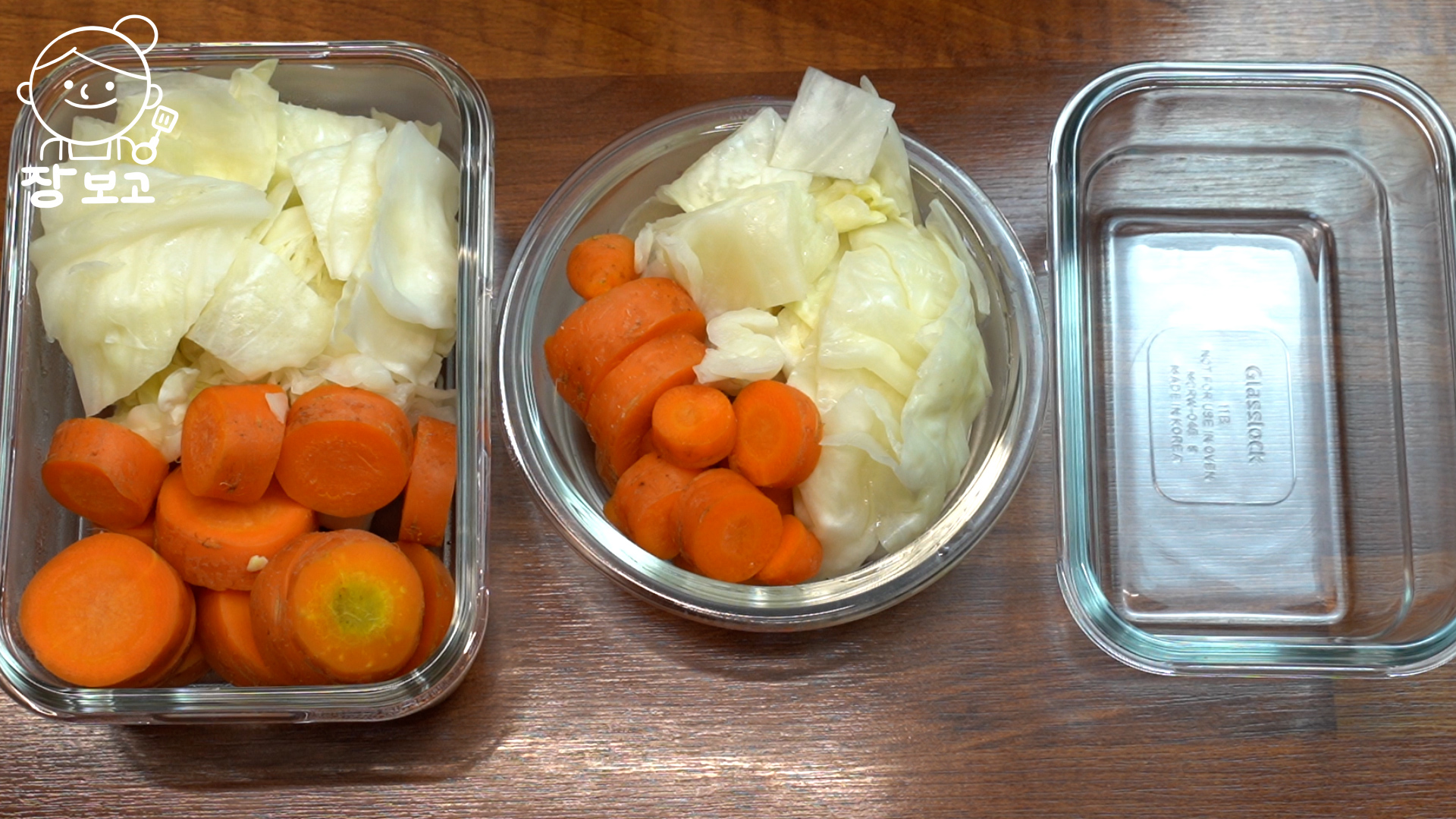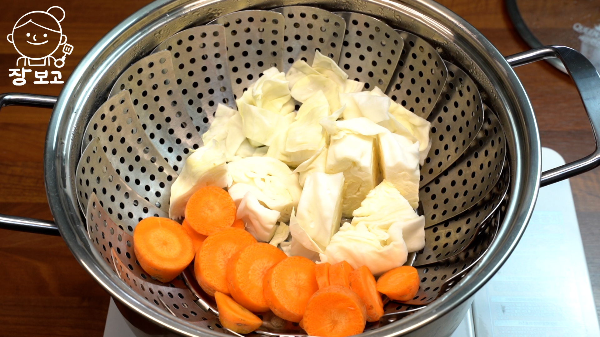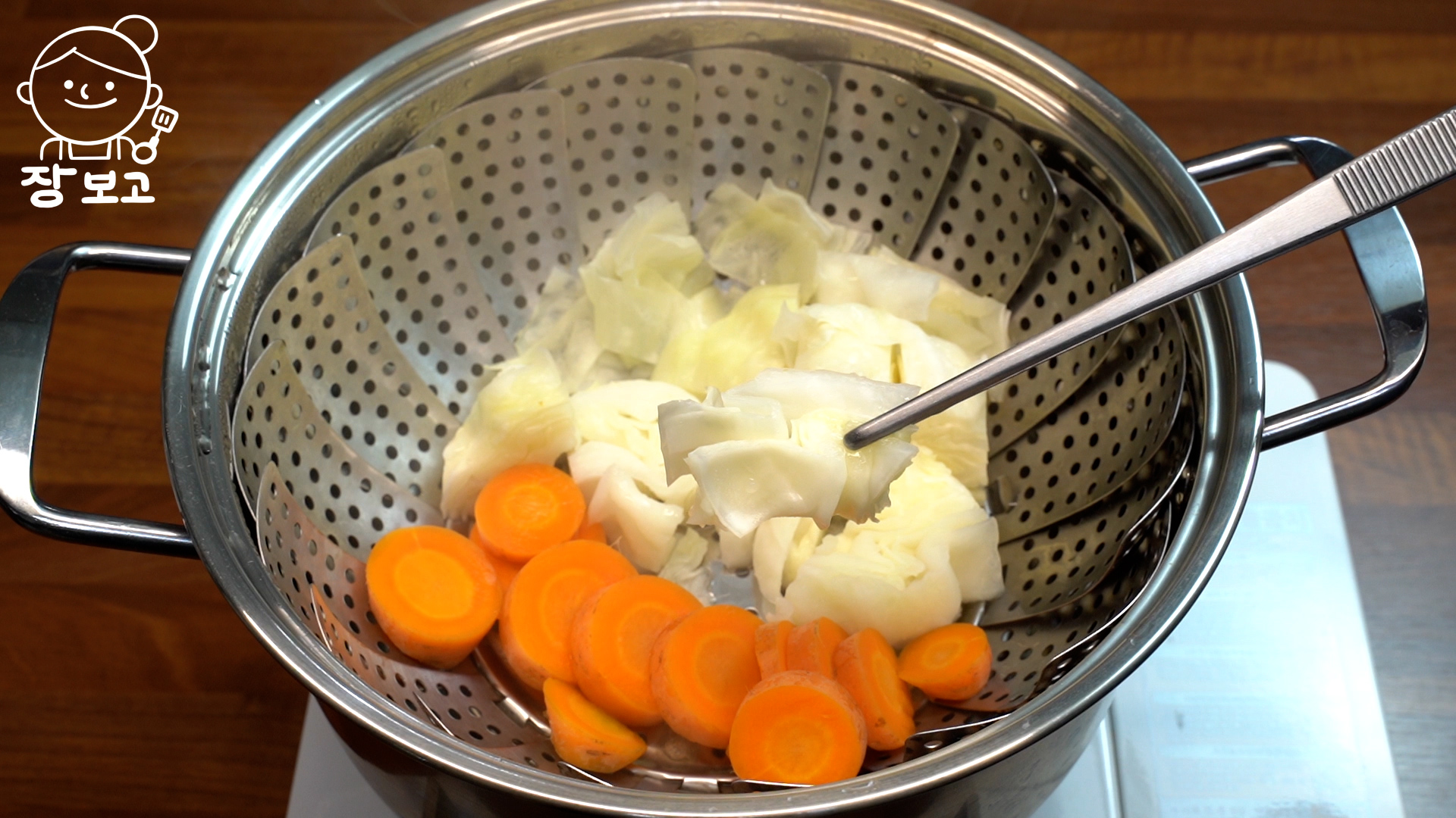3. 찜기에 물 올리고 양배추와 당근을 넣어 4분간 강불로 찐다.
