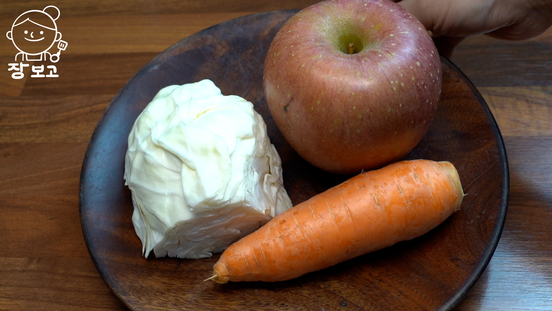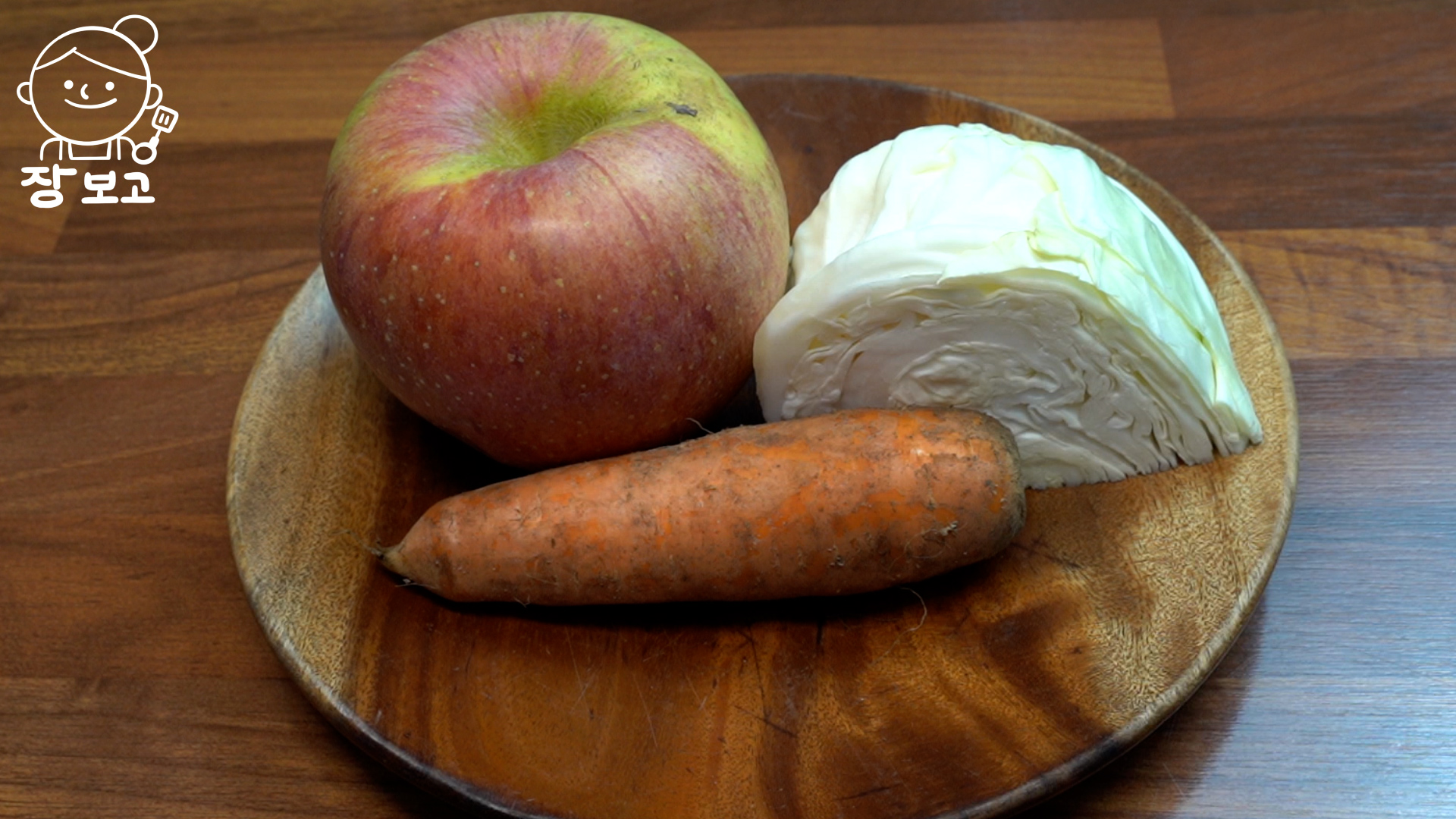 1. 사과 1개, 양배추 200g, 흙당근을 준비한다. 흙당근은 국내산 당근이고 세척용은 중국산이 대부분이다. 흙당근을 깨끗이 씻고, 잔류농약이 걱정이라면 물에 5분간 담궜다가 사용한다.