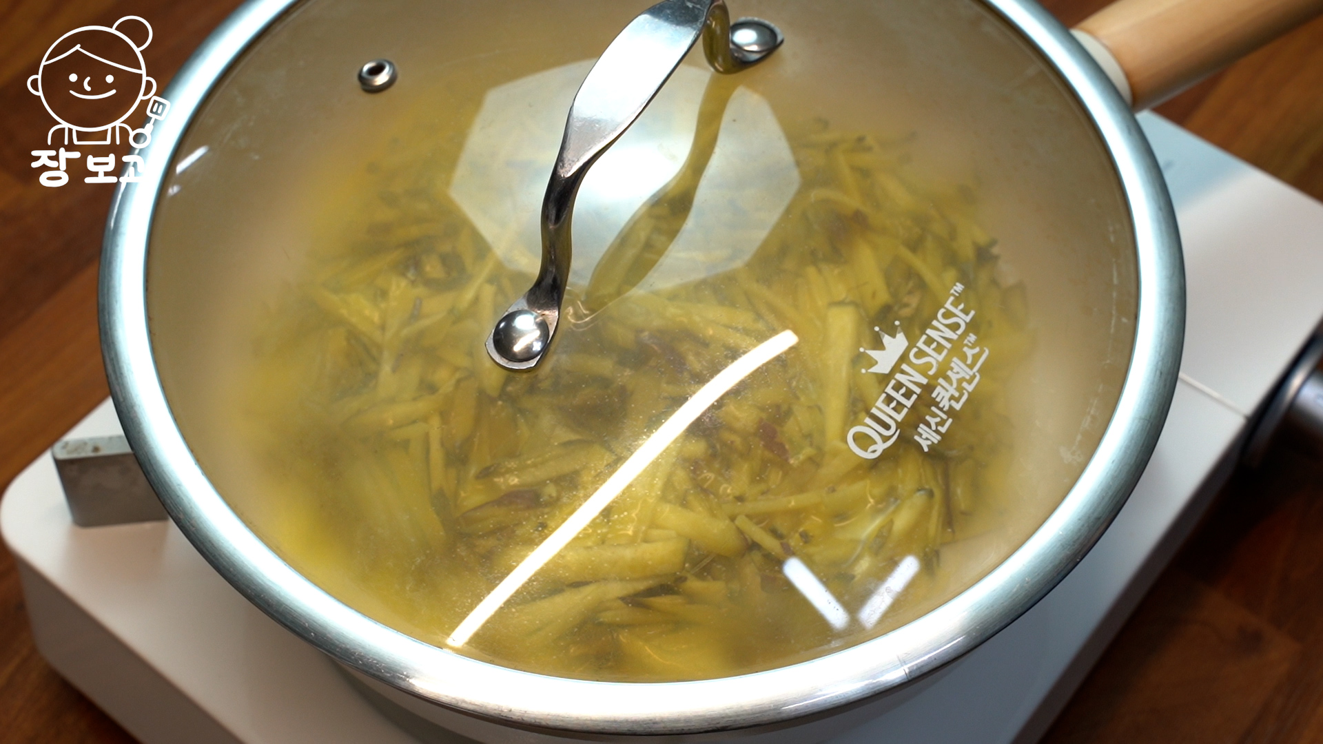 4. 고구마가 익으면 약불로 줄이고 풀어둔 계란을 붓고 뚜껑을 덮어 1분간 익힌다.