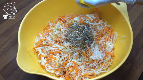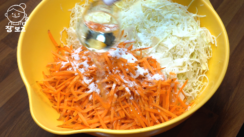 3. 당근과 양배추는 한볼에 담고 소금, 스테비아, 식초를 넣고 버무린다.
