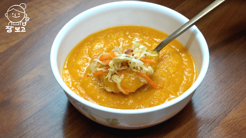 당근과 고구마를 삶아 갈아 만든 죽. 양배추 당근라페를 올려먹으니 외국에서 먹는 수프 느낌 물씬~