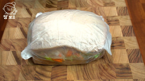 5. 20분 지나면 이렇게 수분이 나와있다. 보통 이 물을 짜서 버리던데, 영양도 그렇고 맛도 국물이 있는 게 훨씬 맛나다. 이대로 사용~