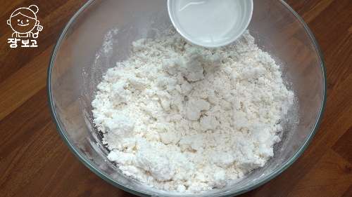 1. 찹쌀가루에 뜨거운 물을 나눠 부어가며 익반죽 한다. 마트표 건식 찹쌀가루는 2컵, 방앗간이나 직접 불려 간 찹쌀가루는 절반인 한 컵정도면 충분하다.