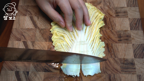 2. 배추는 줄기 끝 가운데를 칼집내고 칼등으로 톡톡 쳐서 평평하게 만든다.