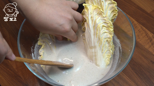6. 절인 배추는 잘 불어진 메밀 반죽에 담가 반죽물을 묻힌다.