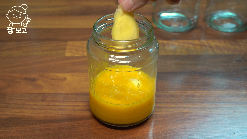 7. 열탕 소독한 유리병에 꿀 귤 간것을 담고 사이에 편 썰어준 생강을 넣는다.